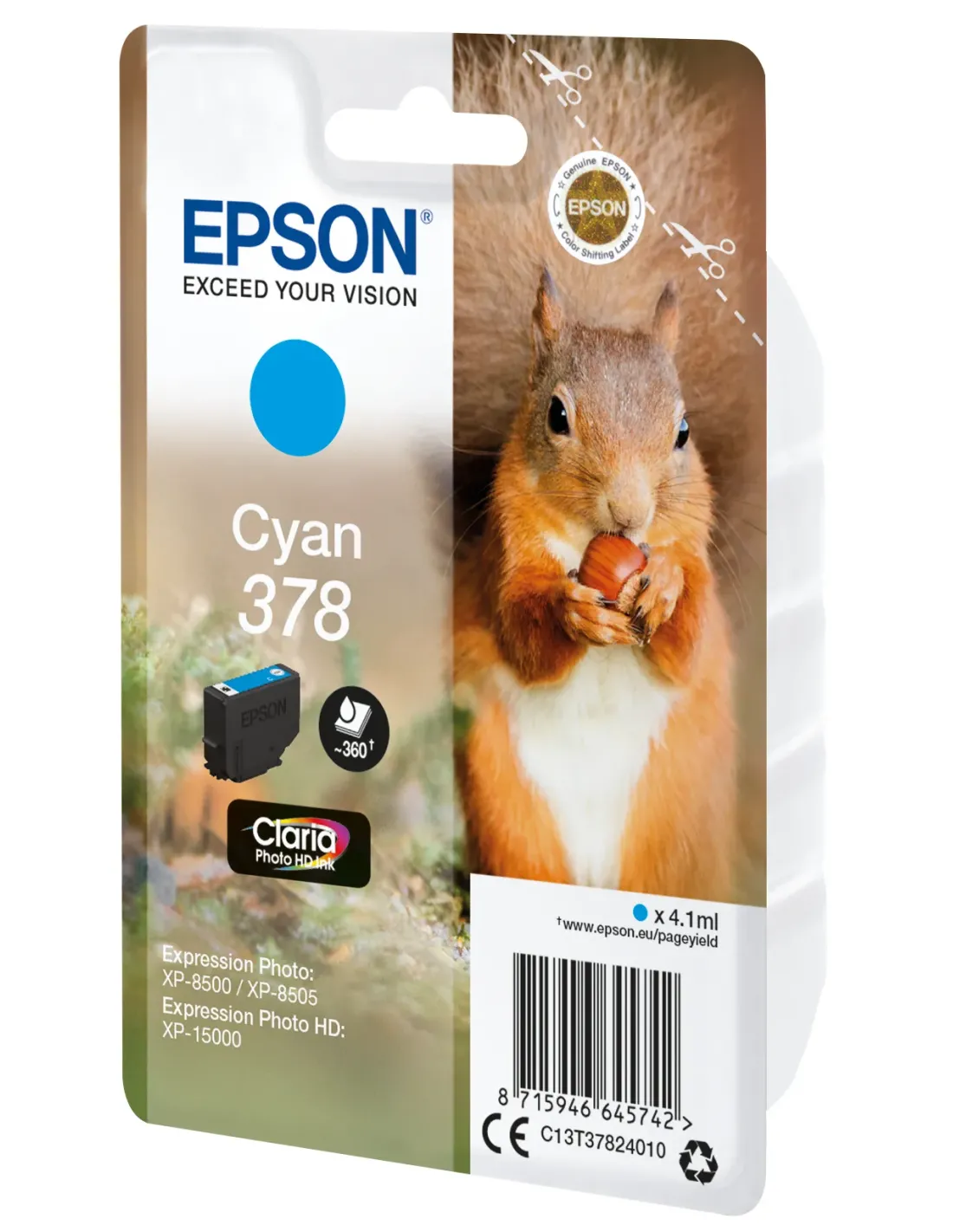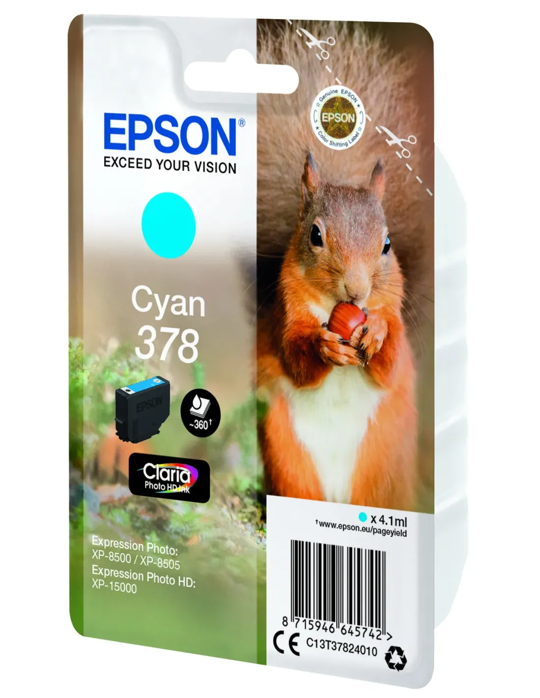 Epson Squirrel Singlepack Cyan 378 Claria Photo HD Ink. Tipo di cartuccia: Resa standard, Resa in pagine dell'inchiostro a colori: 360 pagine, Volume dell'inchiostro a colori: 4,1 ml, Colori di stampa: Ciano, Quantità per pacco: 1 pz