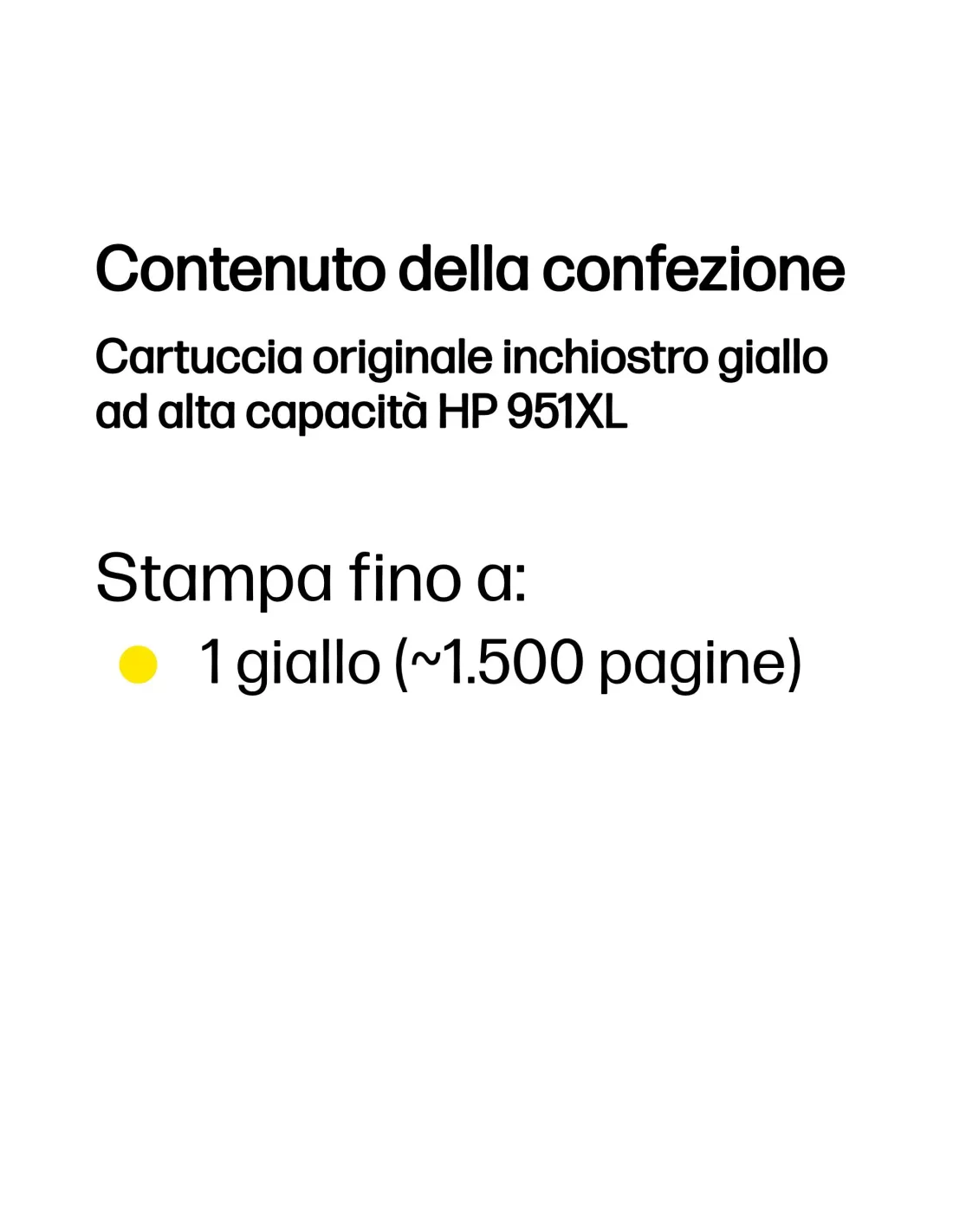 HP Cartuccia originale inchiostro giallo ad alta capacità 951XL. Resa in pagine dell'inchiostro a colori: 1500 pagine, Colori di stampa: Giallo, Quantità per pacco: 1 pz