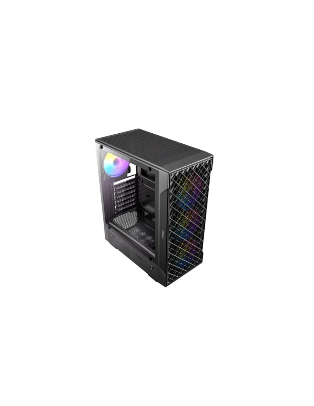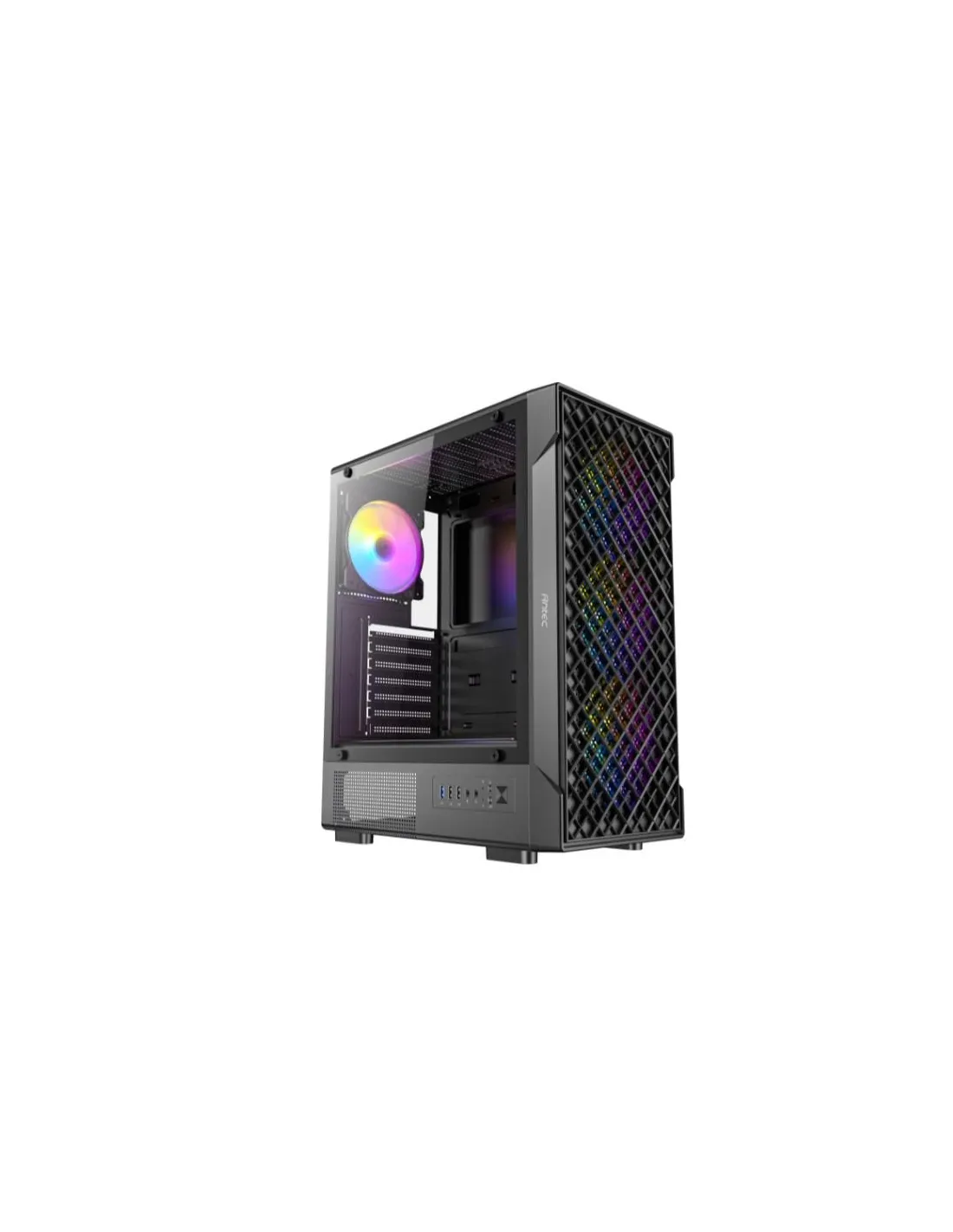 Il design della griglia frontale ventilata migliora il flusso d’aria per un raffreddamento ottimale.Il pannello laterale in vetro temperato semi-panoramico mette in mostra il tuo assemblaggio con stile.Dotato di 3 ventole ARGB frontali e 1 posteriore da 120mm per un'illuminazione brillante e un raffreddamento efficace.Il pannello I/O montato lateralmente offre un facile accesso, incluso il supporto USB 3.0Supporta diverse configurazioni di SSD e HDD per un’ampia capacità di archiviazione.L’ampio spazio per la gestione dei cavi assicura un assemblaggio ordinato e senza problemiIl filtro magnetico superiore impedisce l’ingresso della polvere mantenendo un flusso d’aria ottimale.