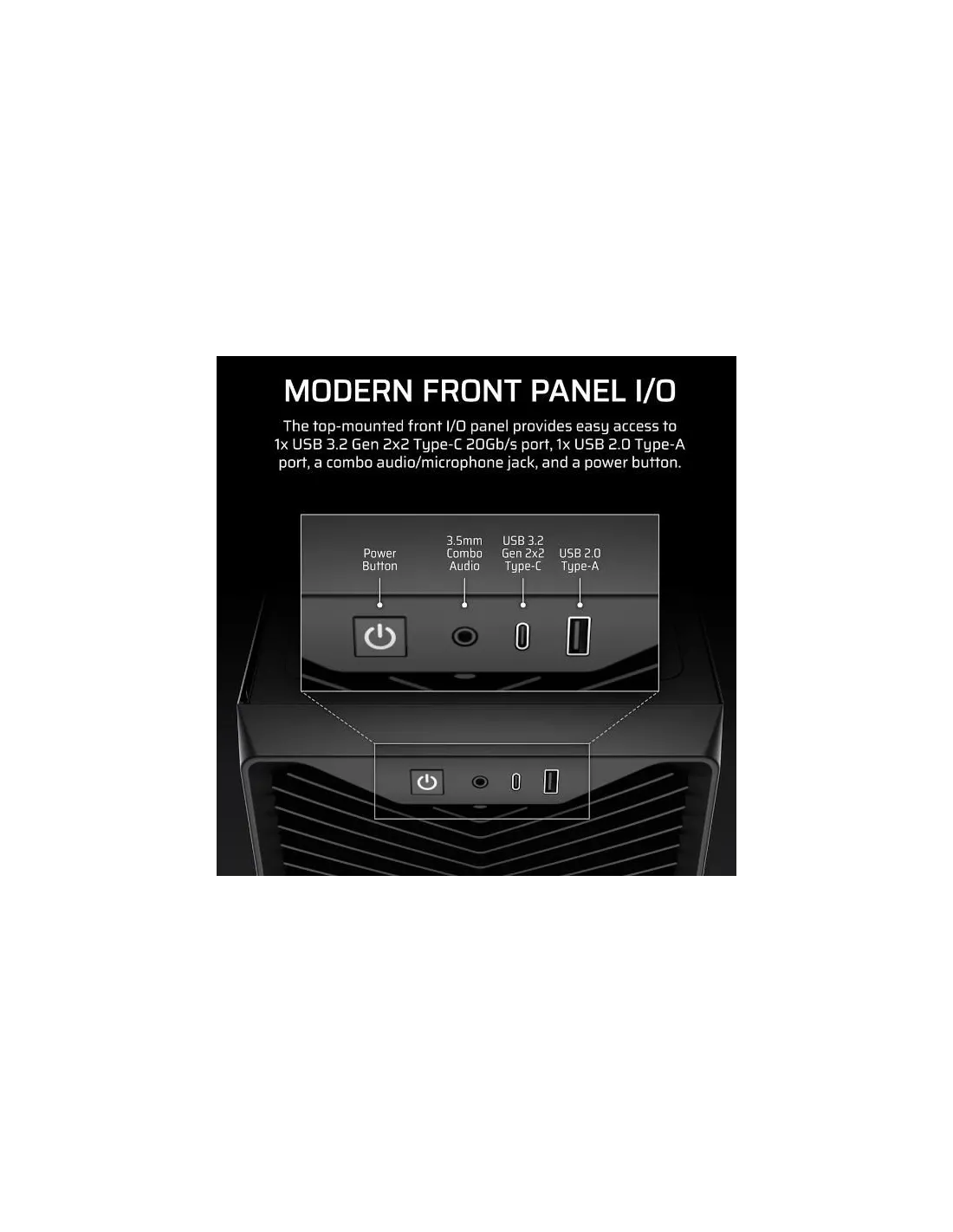 La copertura dell'alimentatore (PSU shroud) include inoltre 2 supporti per ventole da 120 mm, di cui quello anteriore è inclinato direttamente verso la GPU, offrendo una capacità di raffreddamento ancora maggiore per le GPU più esigenti.
