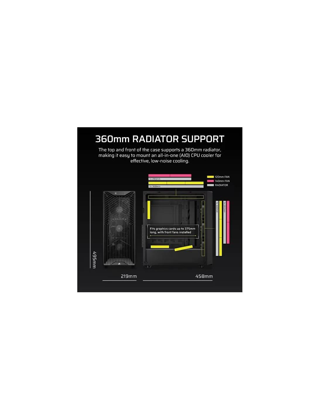 Con 375 mm di spazio disponibile anche con le ventole frontali installate, anche le GPU più potenti hanno molto spazio per dissipare il calore.