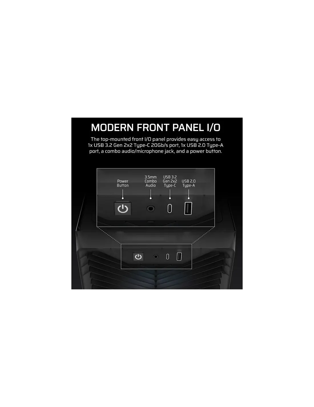 La copertura dell'alimentatore (PSU shroud) include inoltre 2 supporti per ventole da 120 mm, di cui quello anteriore è inclinato direttamente verso la GPU, offrendo una capacità di raffreddamento ancora maggiore per le GPU più esigenti.