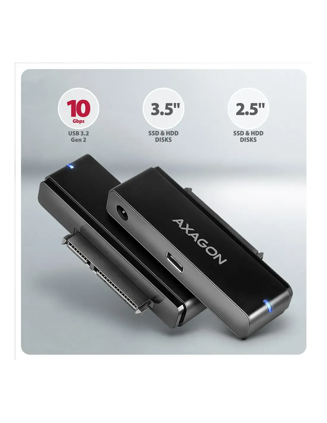 Axagon ADSA-FPX. Interfaccia host: USB tipo-C, Interfaccia di uscita: SATA. Colore del prodotto: Nero, Utilizzo: PC / Notebook / Tablet, Paese di origine: Cina. Velocità massima di trasmissione: 10 Gbit/s. Altri sistemi operativi supportati: Android, ChromeOS. Larghezza: 14 mm, Profondità: 72 mm, Altezza: 29 mm