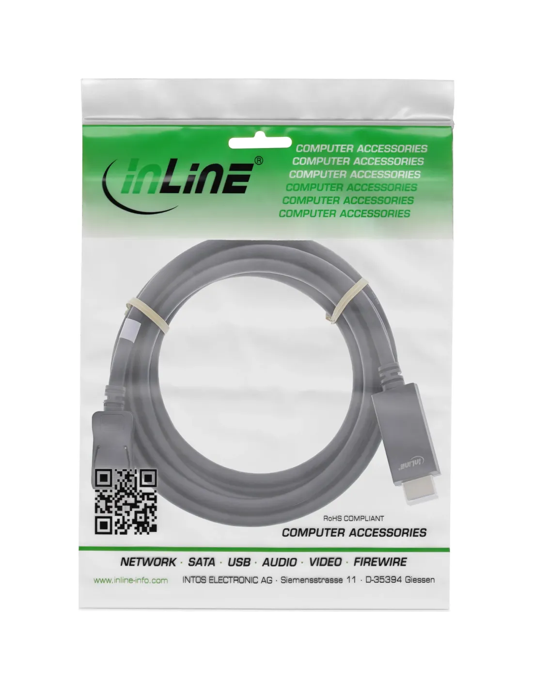 InLine Cavo DisplayPort M a HDMI M, 5m, con Audio, 4K/60Hz, DP1.2, nero. Lunghezza cavo: 5 m, Connettore 1: DisplayPort, Connettore 2: HDMI tipo A (Standard). Peso: 280 g, Larghezza: 22 mm, Profondità: 5000 mm. Larghezza imballo: 190 mm, Profondità imballo: 230 mm, Altezza imballo: 45 mm. Dimensioni (LxPxA): 22 x 5000 x 14 mm