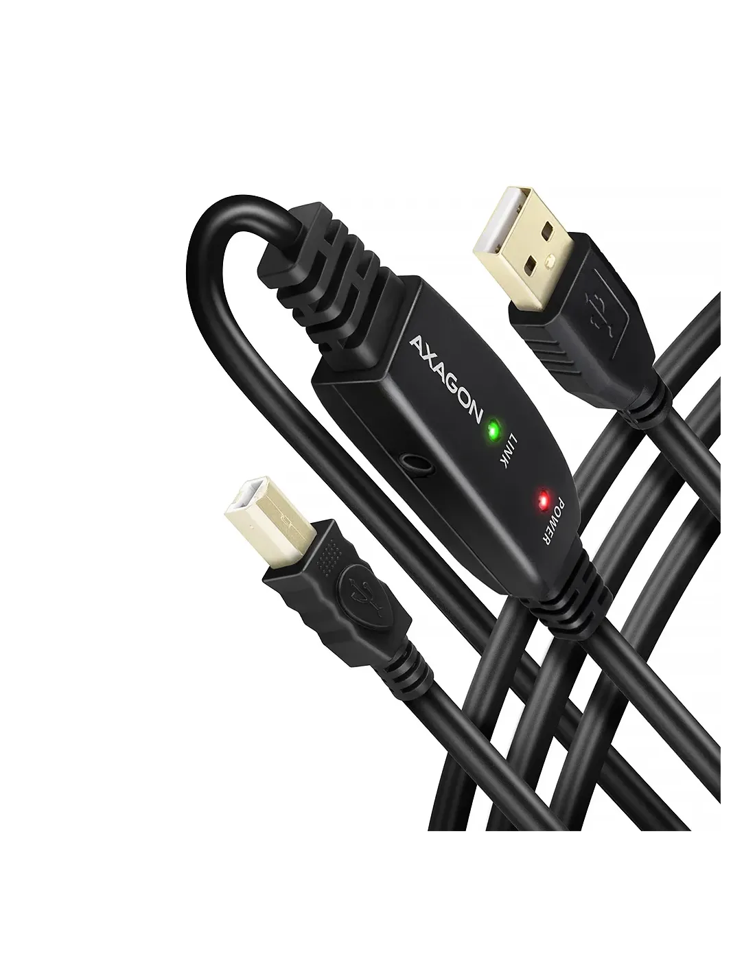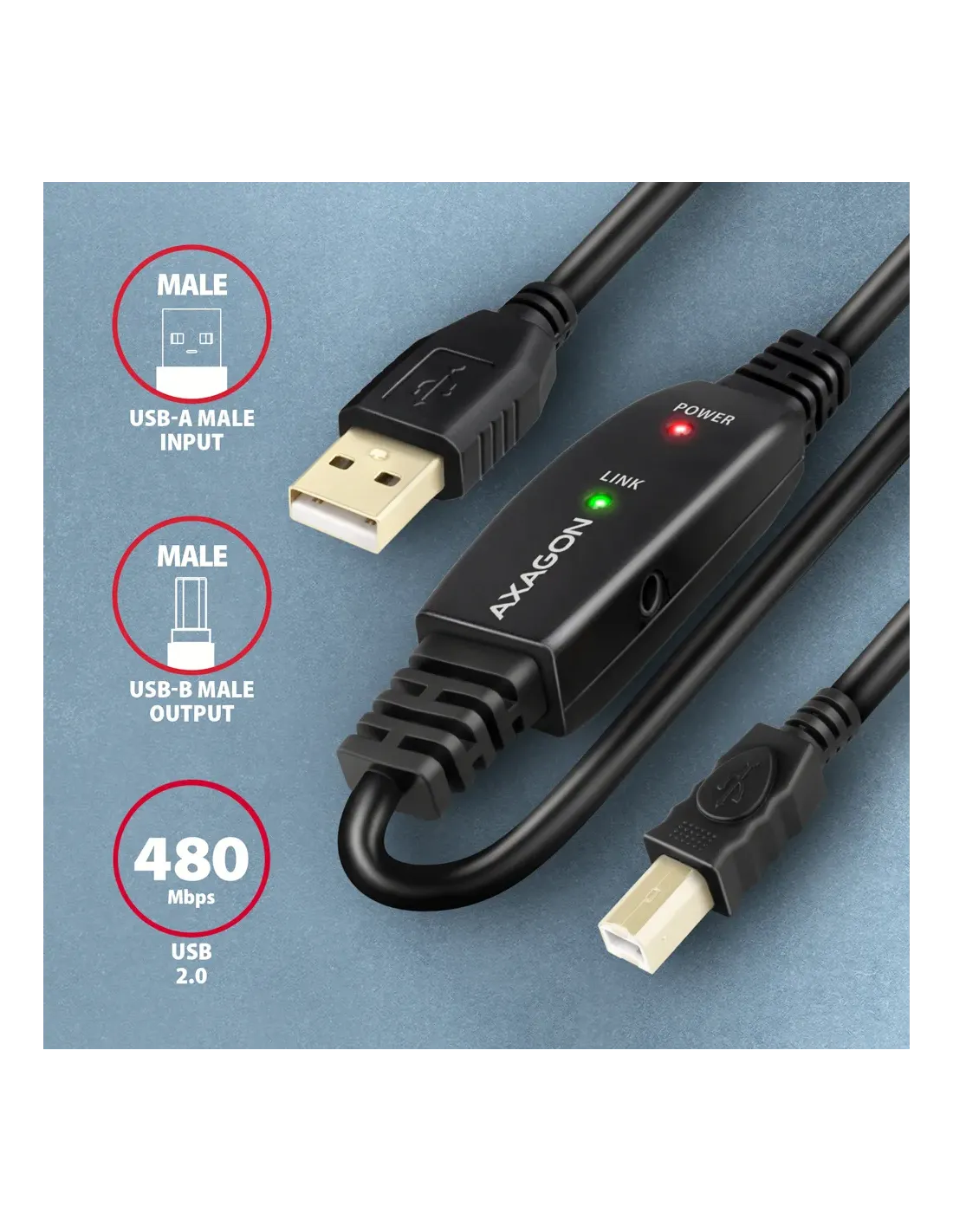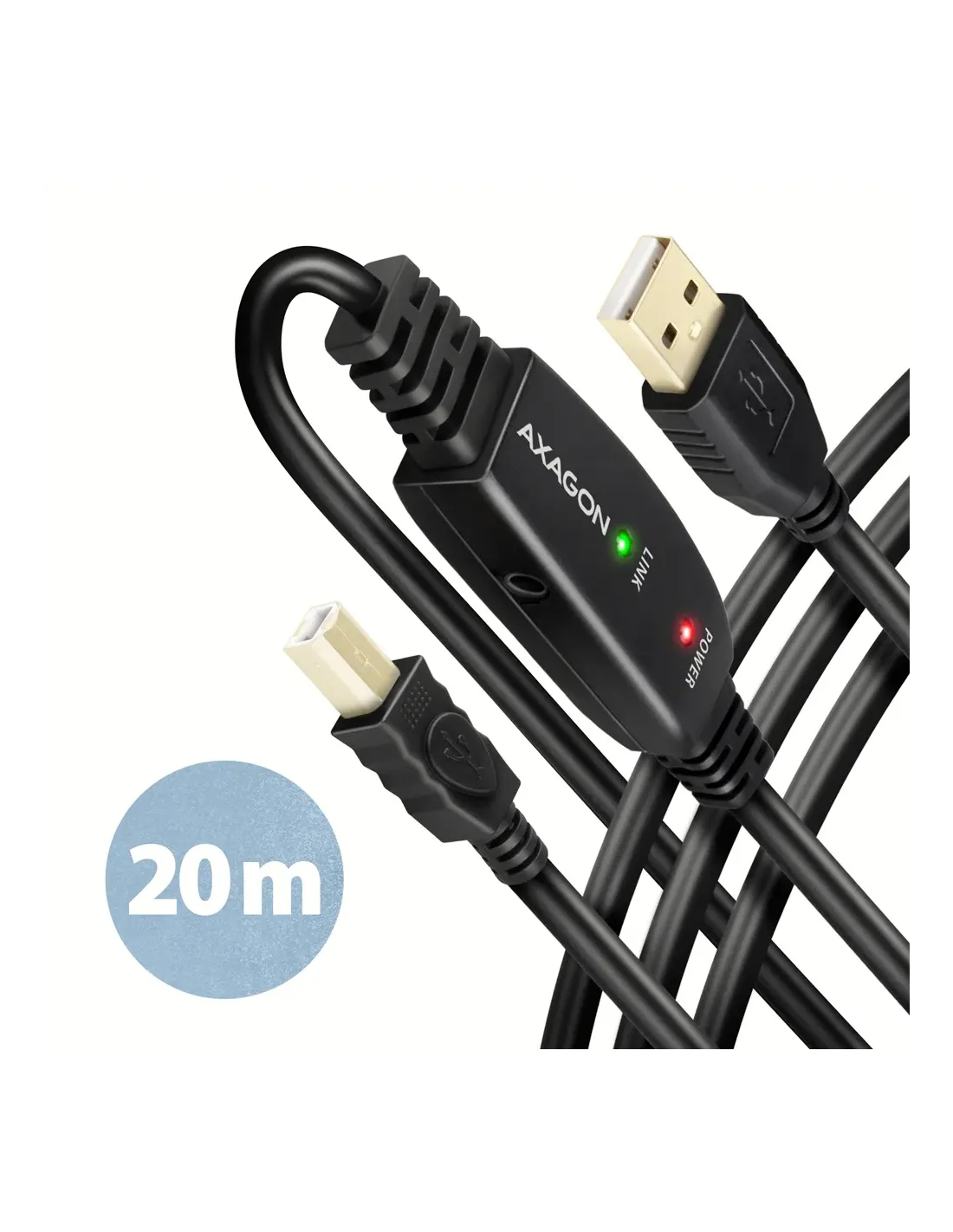 Axagon ADR-220B USB 2.0 A-M -> B-M active connecting/repeater cable 20m - Kabel - Digital/Daten. Lunghezza cavo: 20 m. Connettore 1: USB A, Connettore 2: USB B, Versione USB: USB 2.0, Massima velocità di trasferimento: 0,48 Gbit/s, Colore del prodotto: Nero