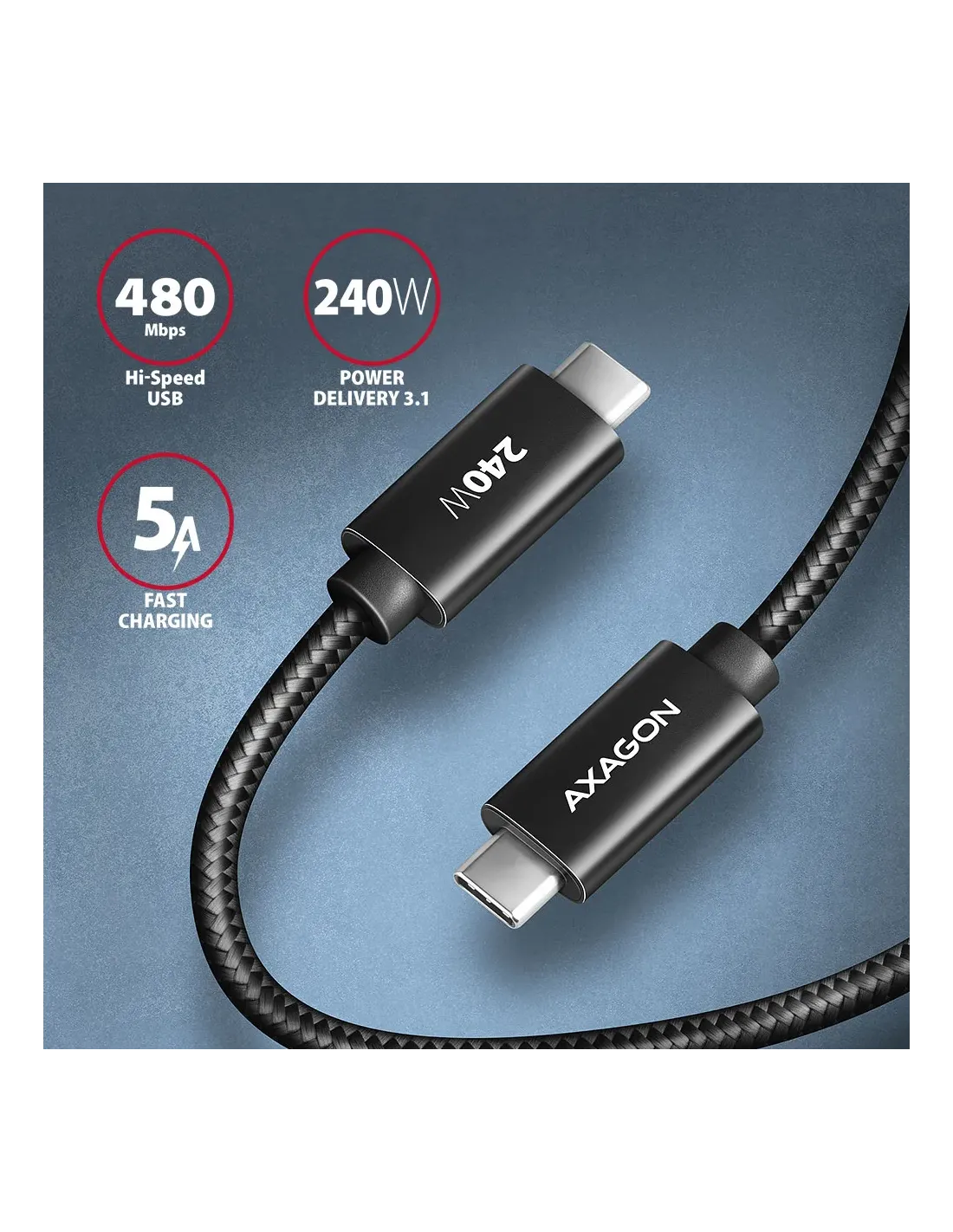 Axagon BUCM2-CM15AB Ladekabel USB-C zu USB-C 2.0, 1,5 m, PD 240 W 5 A, ALU - Schwarz - 1,5 Meter langes USB-C zu USB-C Kabel. Lunghezza cavo: 1,5 m. Connettore 1: USB C, Connettore 2: USB C, Versione USB: USB 2.0, Massima velocità di trasferimento: 0,48 Gbit/s, Placcatura contatti: Oro, Colore del prodotto: Nero