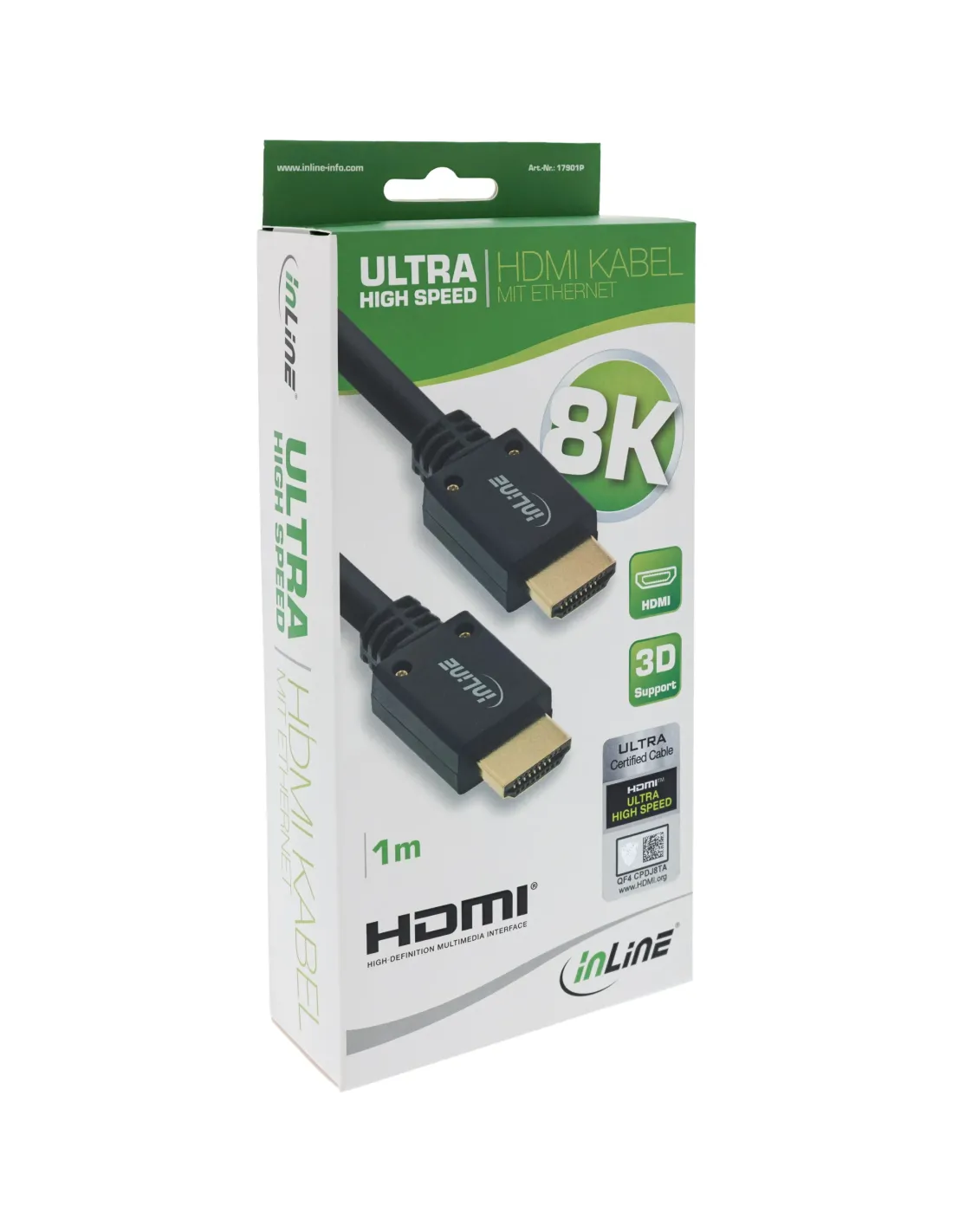 InLine Cavo HDMI Ultra High Speed, 8K4K, M / M, 1m. Lunghezza cavo: 1 m, Connettore 1: HDMI tipo A (Standard), Genere del connettore 1: Maschio, Connettore 2: HDMI tipo A (Standard), Genere del connettore 2: Maschio, Placcatura contatti: Oro, Versione HDMI: 2.1, Compatibilità 3D, Velocità di trasferimento dati: 48 Gbit/s, Colore del prodotto: Nero