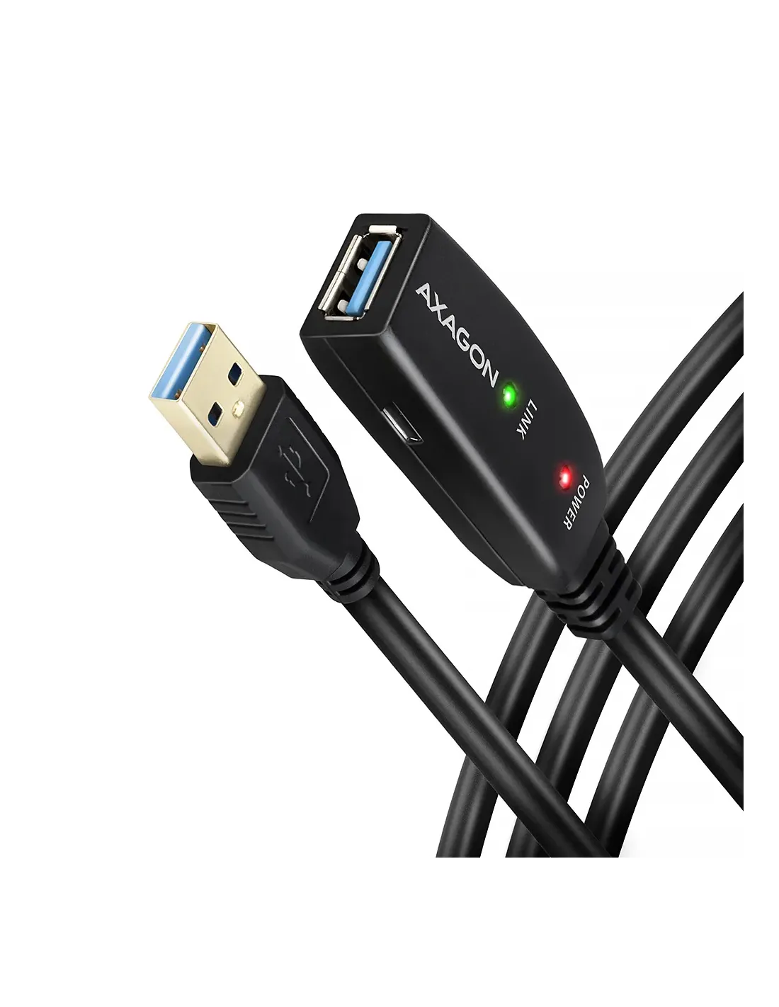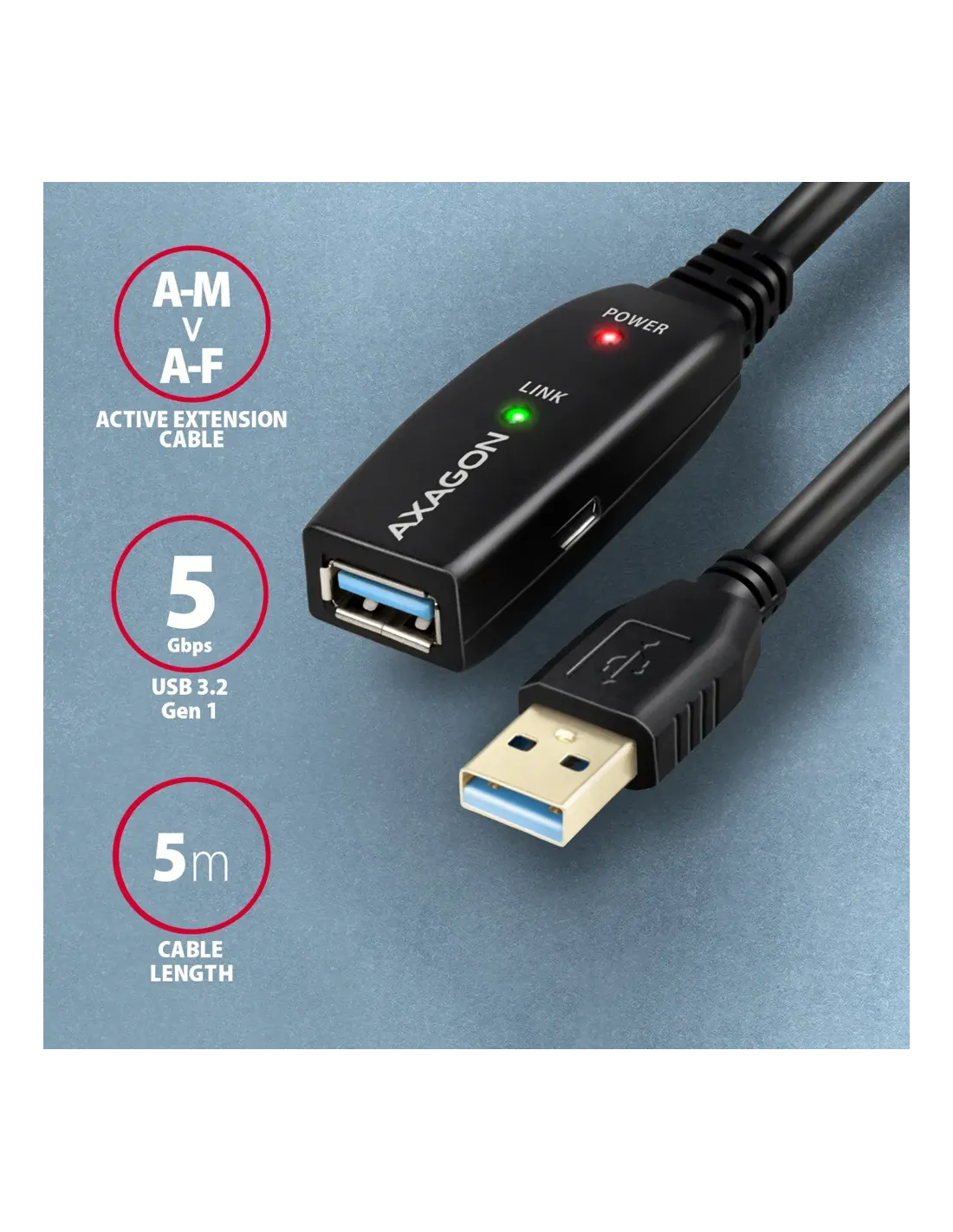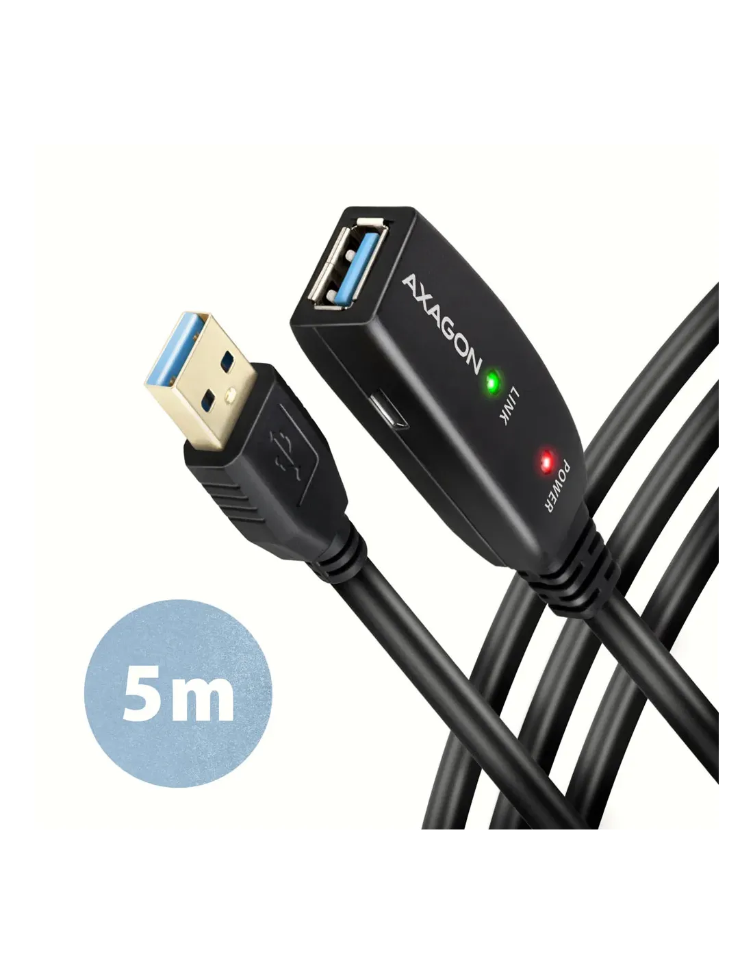 Axagon ADR-305 USB 3.2 Gen 1 A-M -> A-F active extension/repeater cable 5m - Kabel - Digital/Daten. Lunghezza cavo: 5 m. Connettore 1: USB A, Connettore 2: USB A, Versione USB: USB 3.2 Gen 1 (3.1 Gen 1), Massima velocità di trasferimento: 5 Gbit/s, Colore del prodotto: Nero