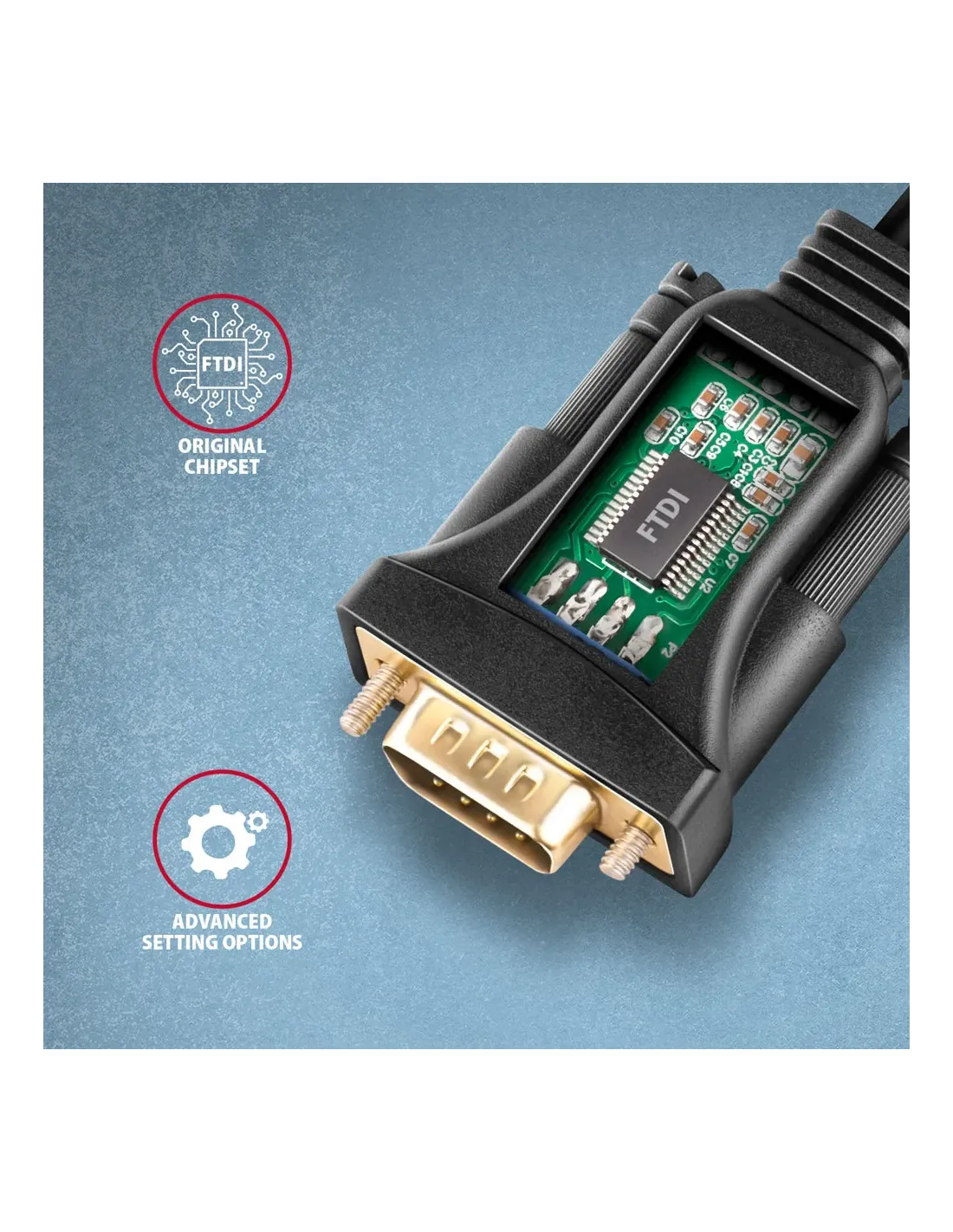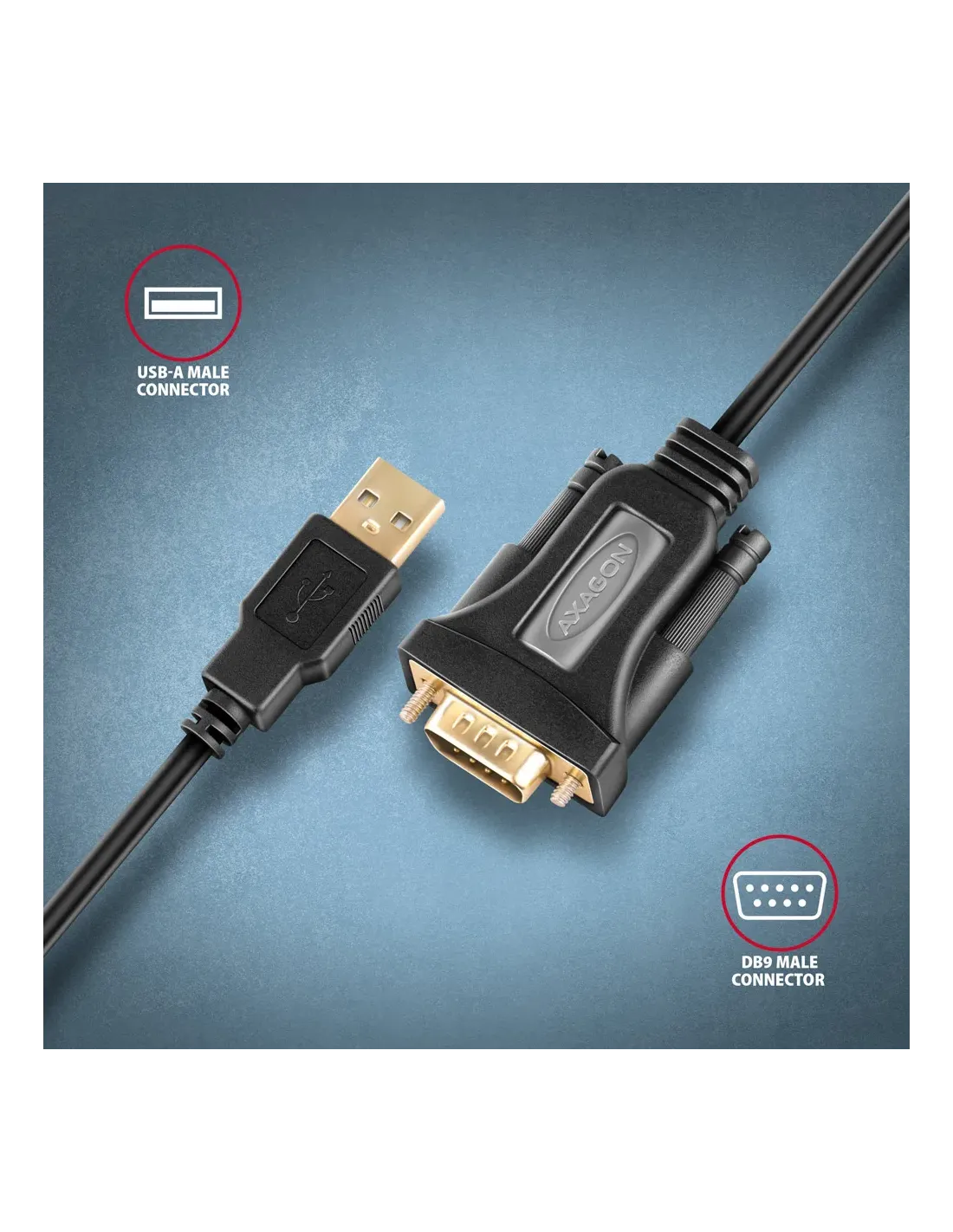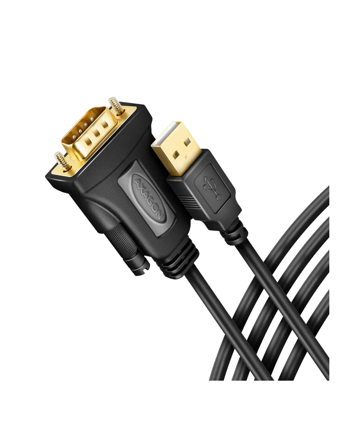 Axagon ADS-1PQN USB-A 2.0 - serial RS-232 DB9-M FTDI adapter cable 1.5m - Adapter - Digital/Daten. Colore del prodotto: Nero, Lunghezza cavo: 1,5 m, Connettore 1: USB tipo A. Quantità per pacco: 1 pz, Tipo di imballo: Scatola, Larghezza imballo: 150 mm. Certificati di conformità: RoHS, CE, Certificazione: CE, RoHS. Diametro del cavo: 5 mm, Larghezza: 35 mm, Profondità: 56 mm
