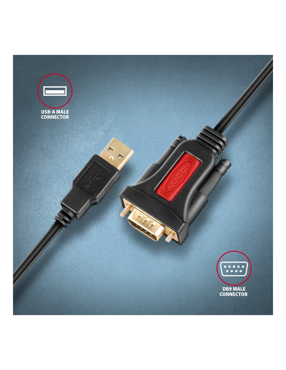 Axagon ADS-1PSN USB-A 2.0 - serial RS-232 DB9-M Prolific adapter cable 1.5m - Adapter - Digital/Daten. Colore del prodotto: Nero, Lunghezza cavo: 1,5 m, Connettore 1: USB tipo A. Quantità per pacco: 1 pz, Tipo di imballo: Scatola, Larghezza imballo: 150 mm. Certificati di conformità: RoHS, CE, Certificazione: CE, RoHS. Diametro del cavo: 5 mm, Larghezza: 35 mm, Profondità: 56 mm