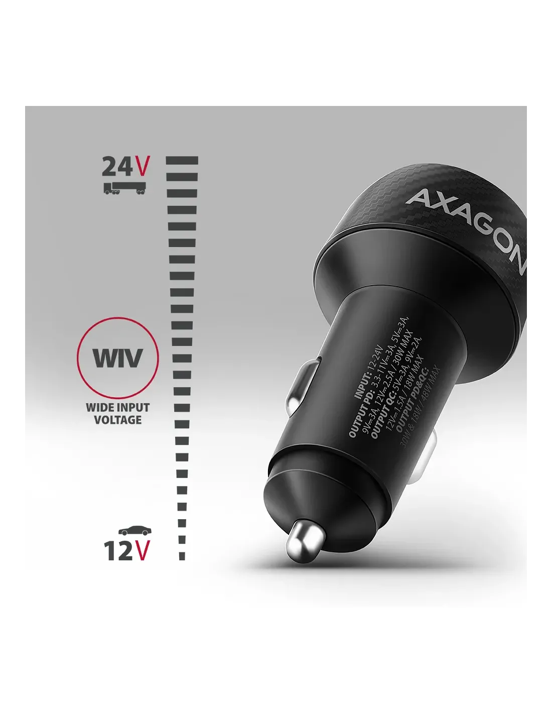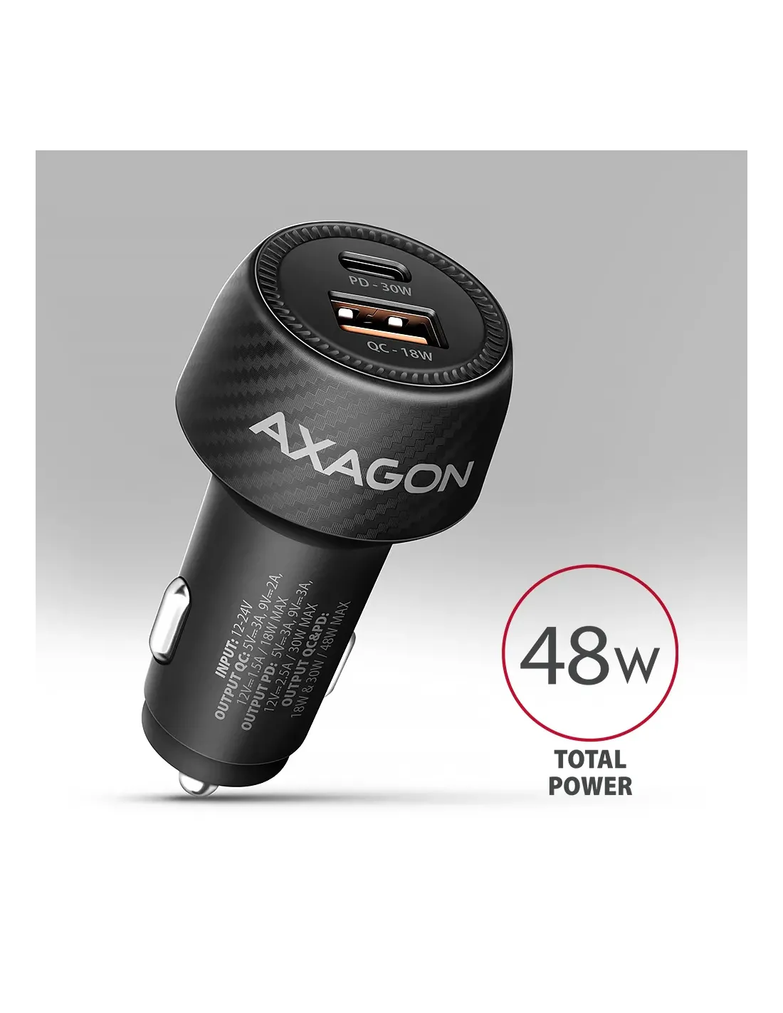 Axagon PWC-PQ48. Tipo di caricatore: Auto, Tipologia alimentazione: Accendisigari, Compatibilità caricatore: Universale. Voltaggio di ingresso: 12 - 24 V. Quantità porte USB 2.0: 1, Quantità di porte USB Tipo C: 1, Ricarica rapida, Funzionalità di protezione dell'alimentazione: Sovracorrente, Sovraccarico, Surriscaldamento, Cortocircuito. Colore del prodotto: Nero