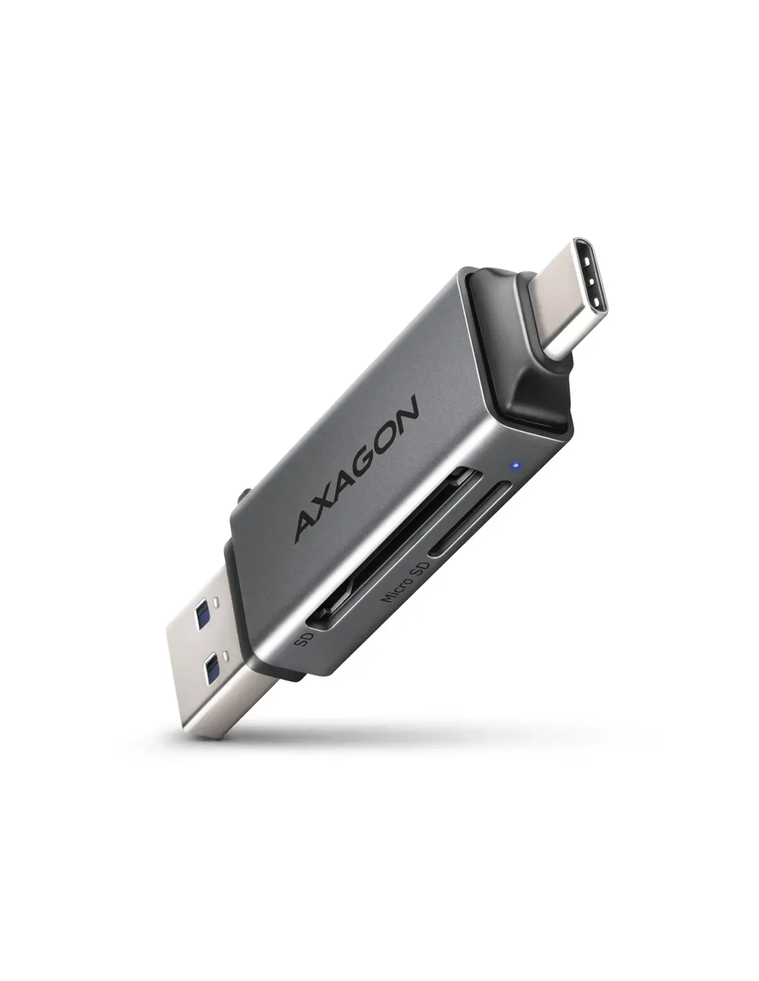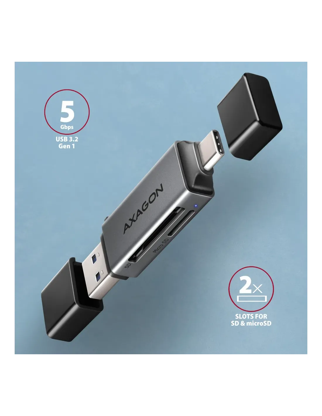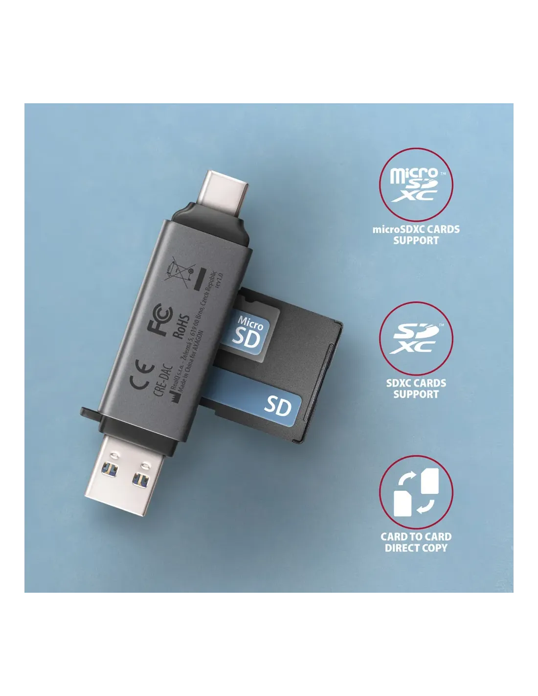 Axagon CRE-DAC USB-C+ USB-A 5 Gbps MINI card reader 2-slot & lun SD/microSD, MMC, MicroSD (TransFlash), MicroSDHC, MicroSDXC, RS-MMC, SD, SDHC, SDXC, Grigio, 5000 Mbit/s, Alluminio, CE, RoHS, USB 3.0 Type-A/Type-C