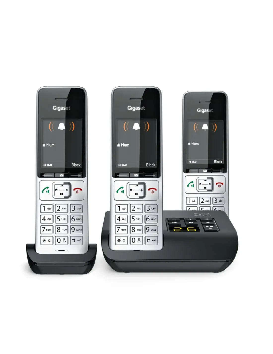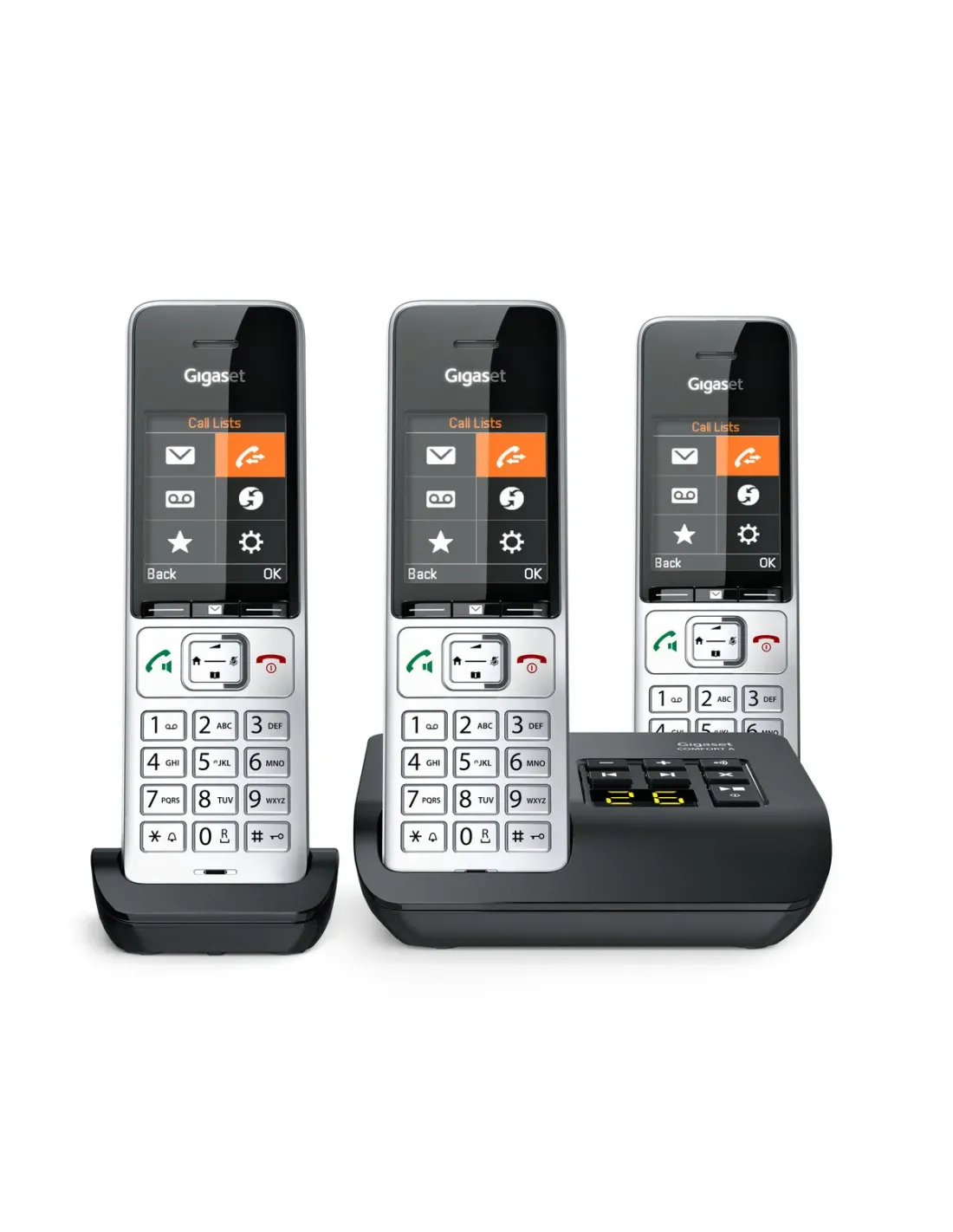 Gigaset COMFORT 500A Trio. Tipo: Telefono analogico/DECT, Tipo di apparecchio: Cornetta cablata. Telefono con vivavoce, Capacità rubrica: 200 voci. Identificatore di chiamata. Dimensioni diagonale schermo: 5,59 cm (2.2"). Short Message Service (SMS). Colore del prodotto: Nero, Argento. Numero di cornette incluse: 3