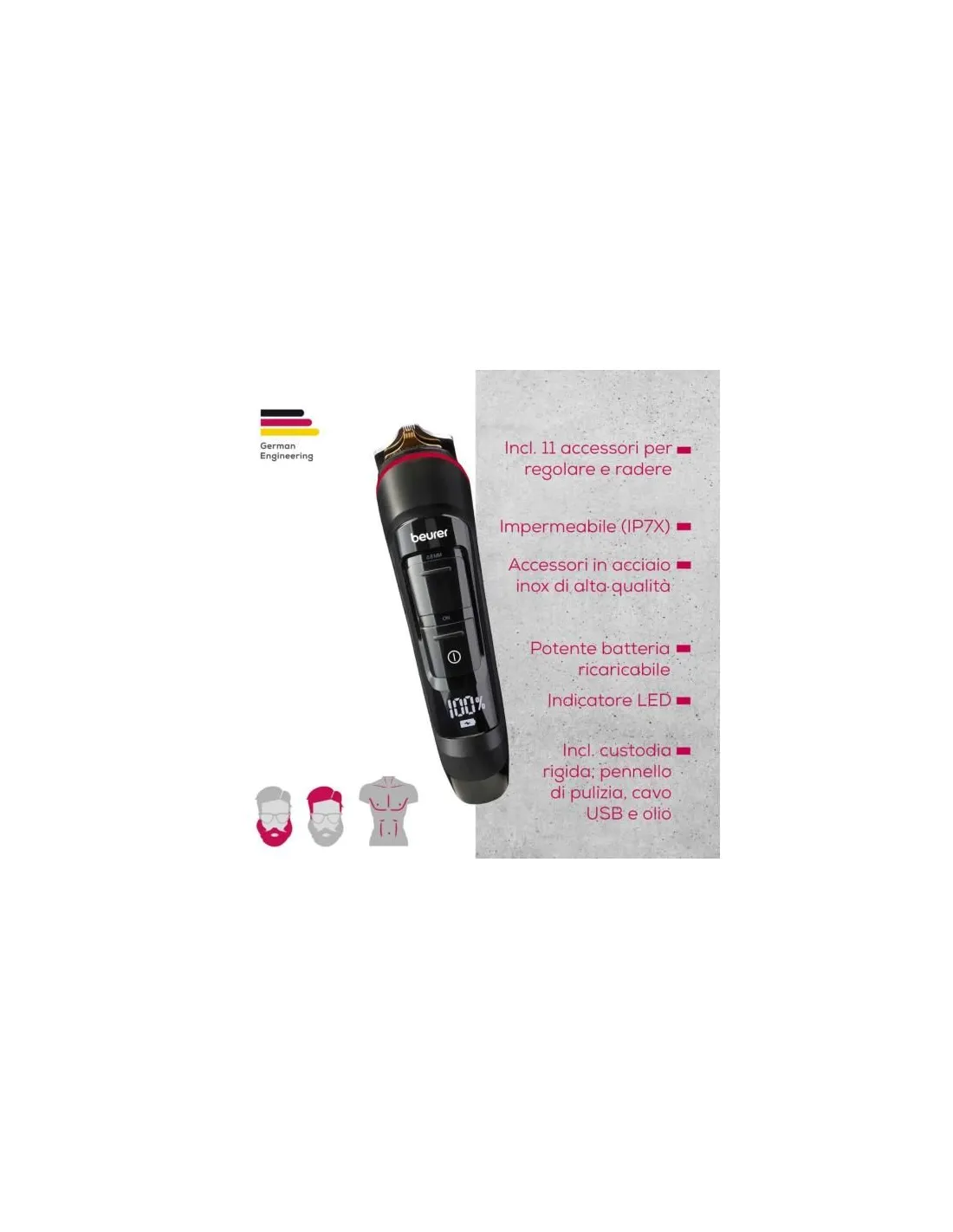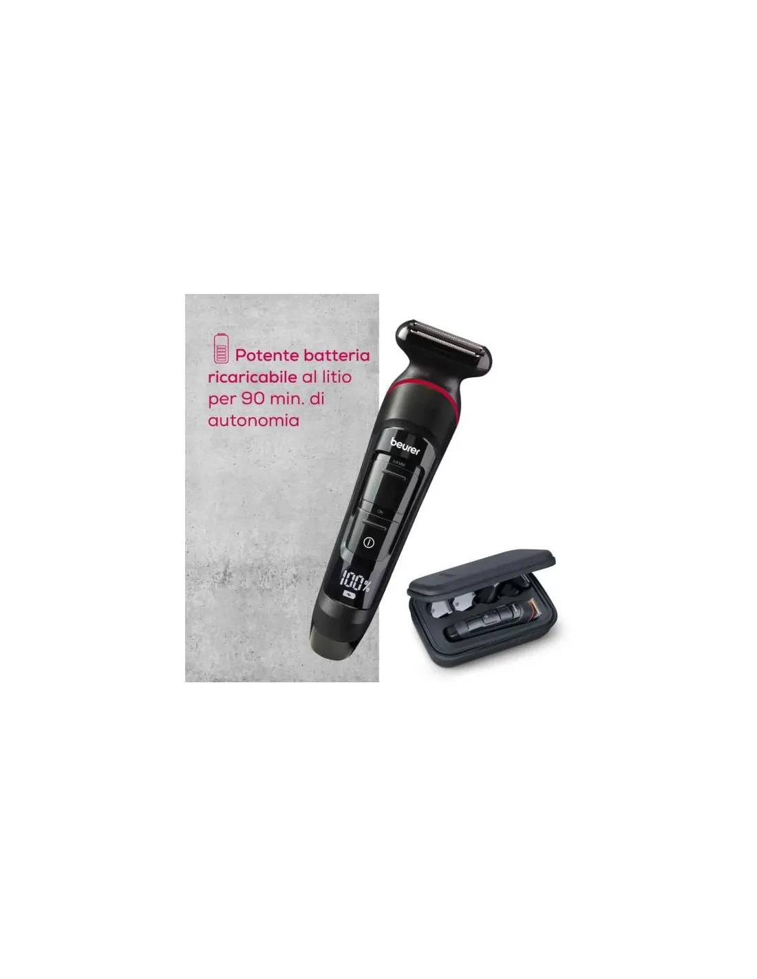 Strumento versatile e impermeabile per i peli di tutto il corpo. Con il rasoio elettrico e corpo MN9X di Beurer puoi prenderti cura dei peli di tutto il corpo in tutta semplicità. Grazie agli accessori di alta qualità e alle diverse lunghezze di taglio, tutti possono trovare l'impostazione giusta. Inoltre, il dispositivo è impermeabile e quindi può essere utilizzato anche sotto la doccia o nella vasca da bagno.
