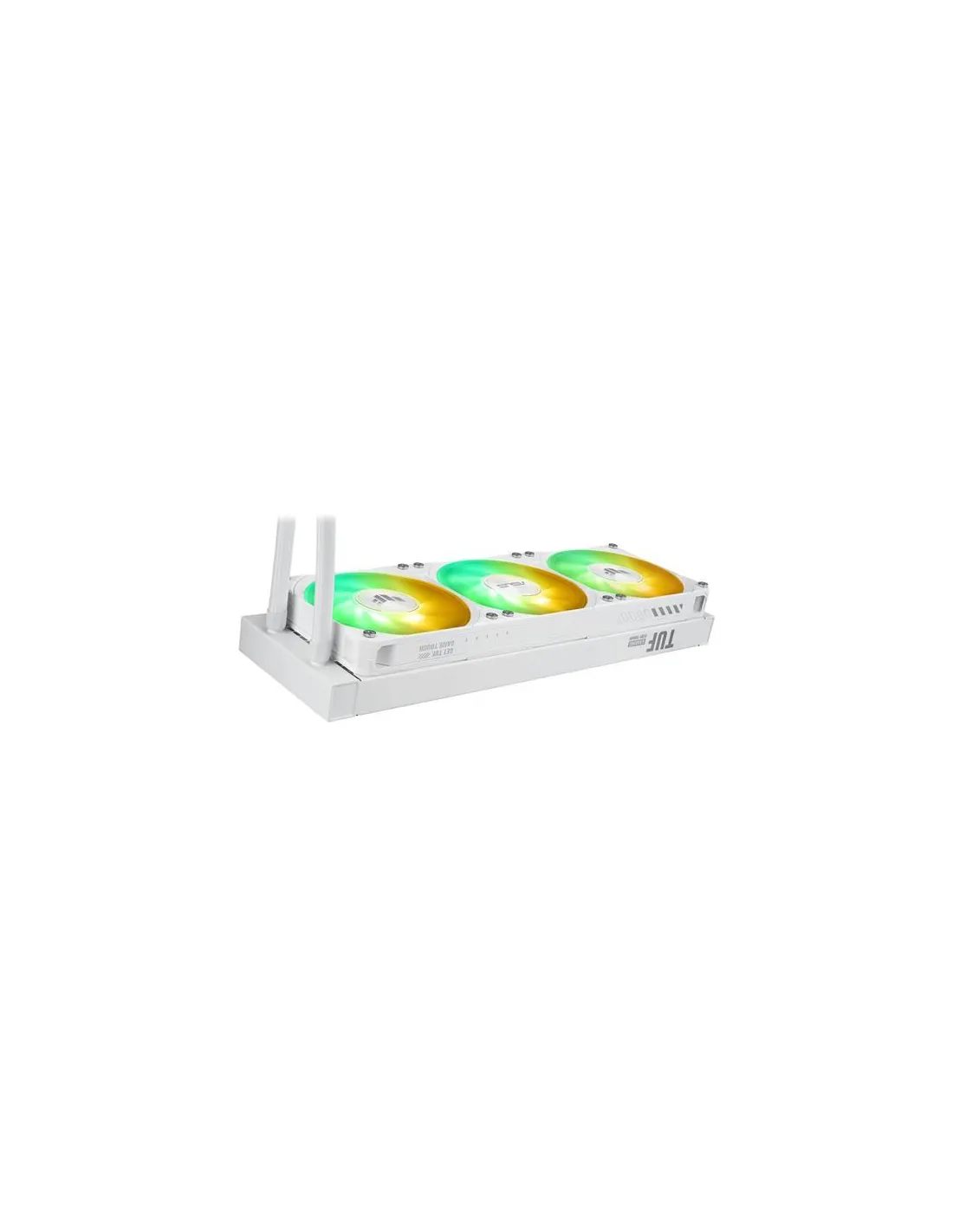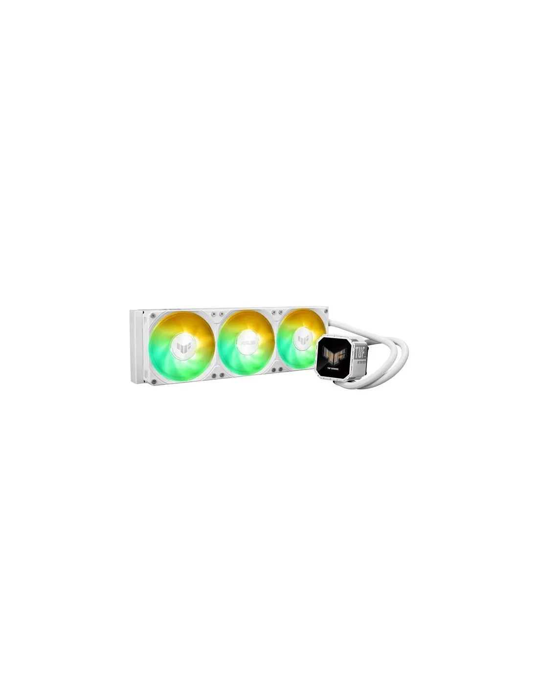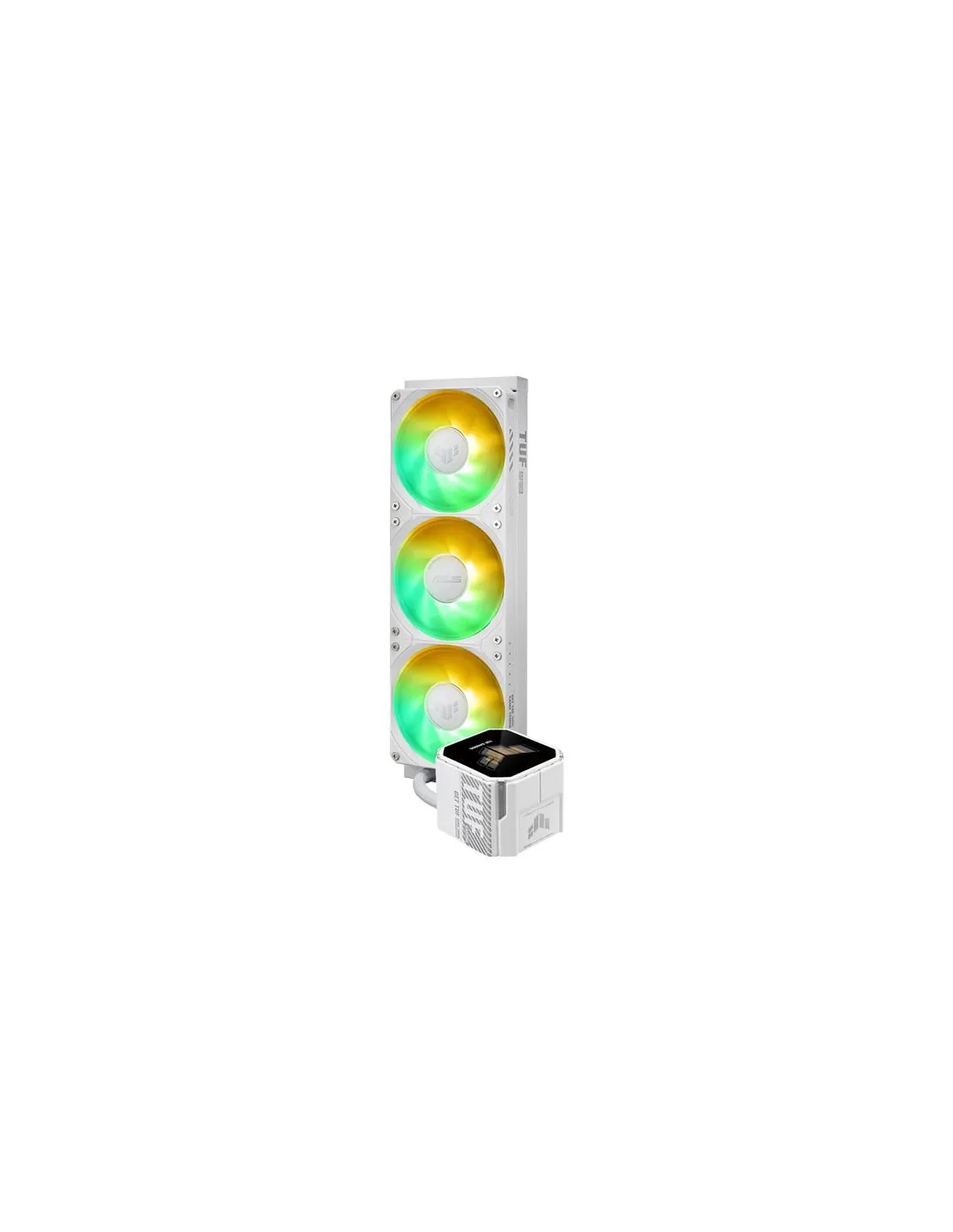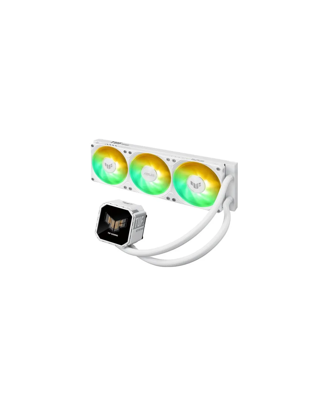 TUF Gaming LC III 360 ARGB LCD White Edition, sistema di raffreddamento a liquido per CPU all-in-one con ventole triple preinstallate e integrate, progettate per un flusso d'aria elevato e una pressione statica elevata; LCD da 2,8" per il monitoraggio dell'hardware, GIF personalizzate e videoclip MP4