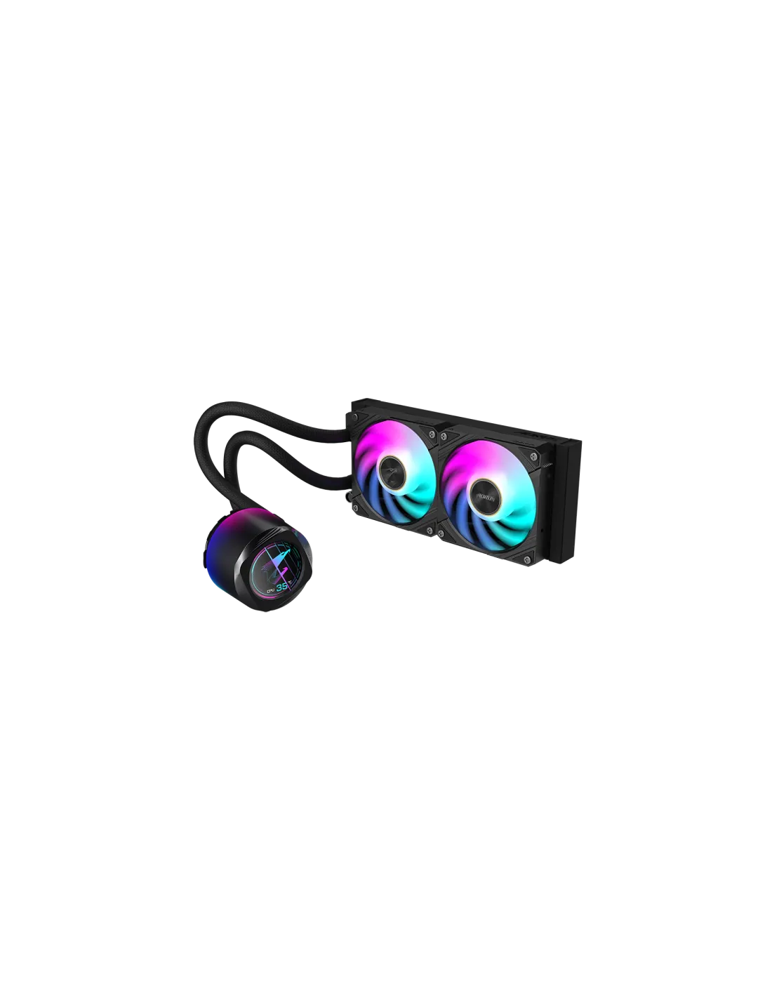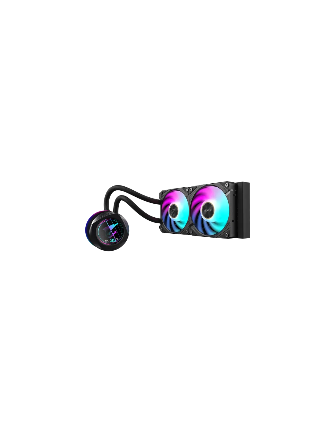 Il waterblock e la ventola sono dotati di illuminazione sfumata e l'illuminazione della ventola ARGB può essere sincronizzata con altri dispositivi AORUS tramite GCC (GIGABYTE Control Center).