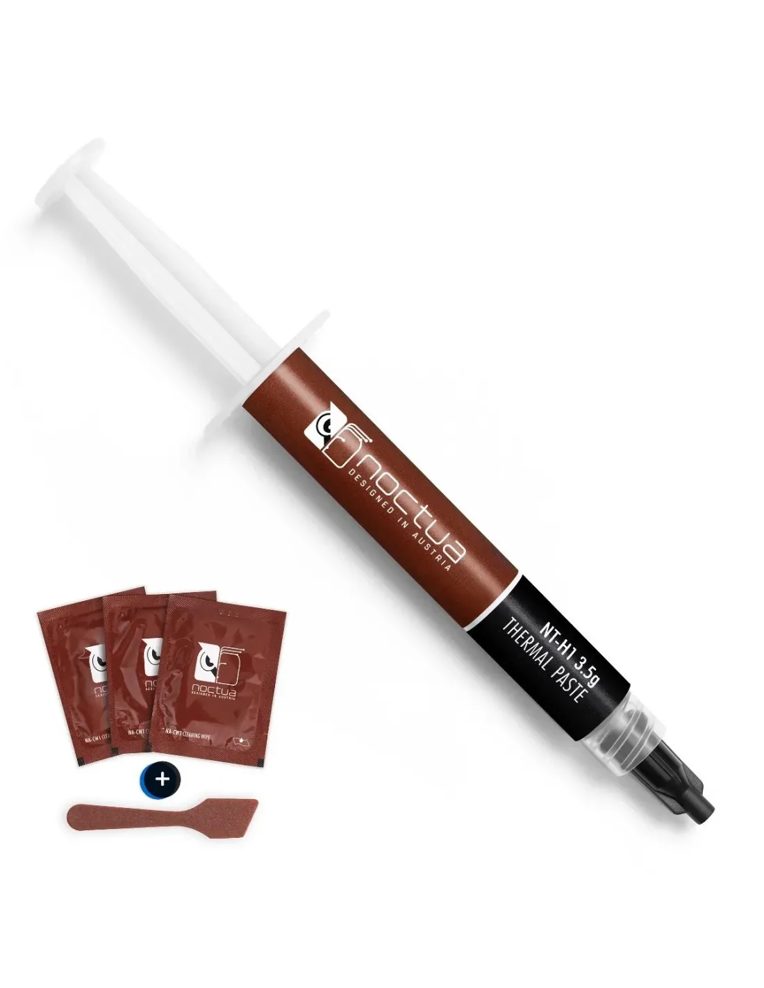 Noctua NT-H1. Tipo: Pasta termica, Densità: 2,49 g/cm³, Colore del prodotto: Grigio. Volume: 1,4 ml, Peso: 3,5 g. Quantità per pacco: 1 pz, Larghezza imballo: 70 mm, Profondità imballo: 30 mm
