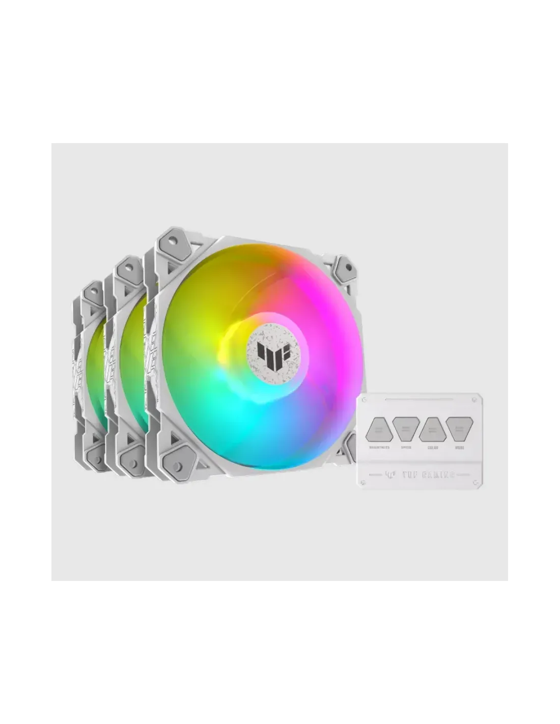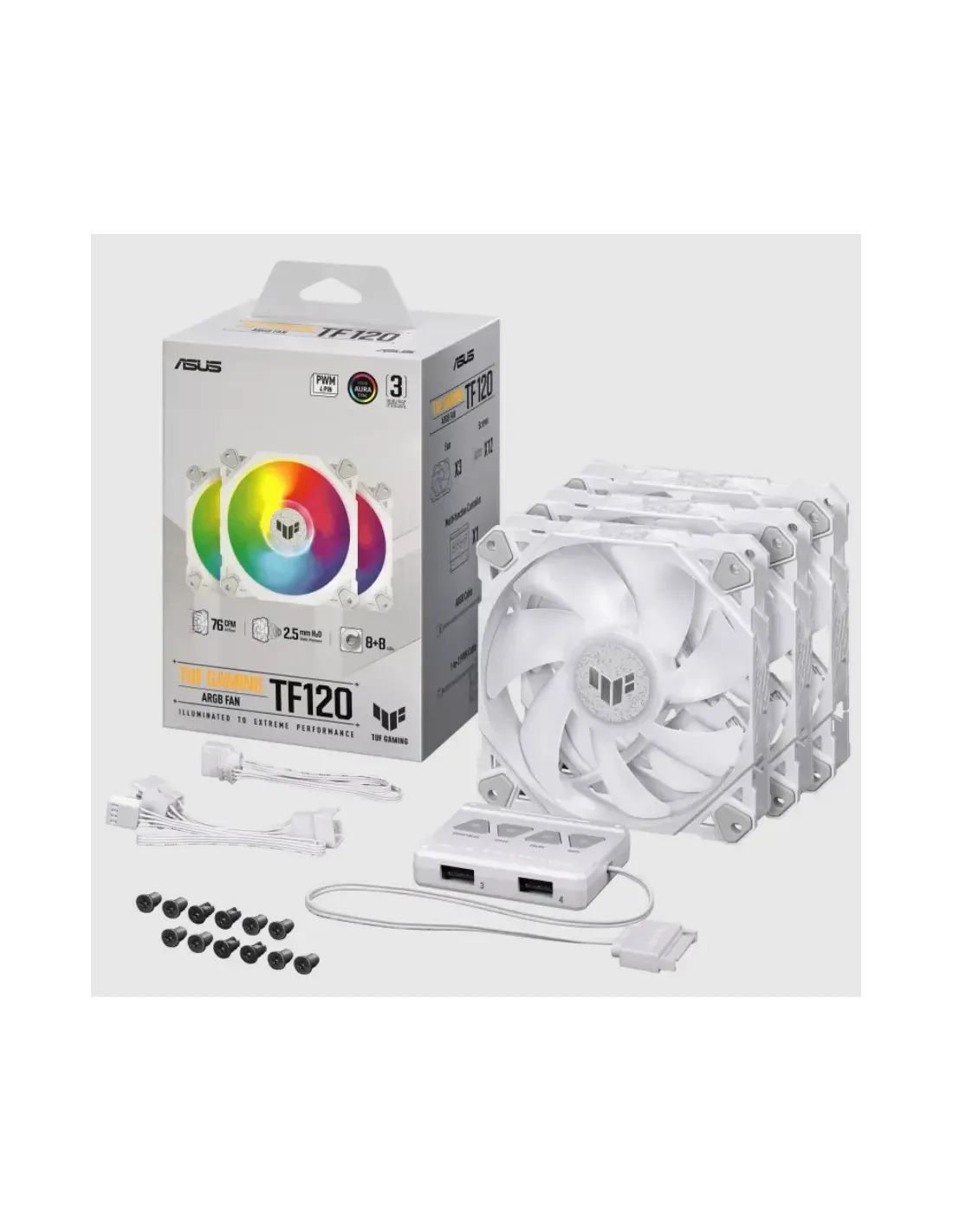 ASUS TUF GAMING TF120 ARGB WHITE EDITION 3IN1. Tipo: Raffreddatore d'aria, Diametro del ventilatore: 12 cm, Velocità (minima) di rotazione: 250 Giri/min, Velocità (massima) di rotazione: 1900 Giri/min. Larghezza: 120 mm, Profondità: 120 mm, Altezza: 25 mm. Colore del prodotto: Bianco