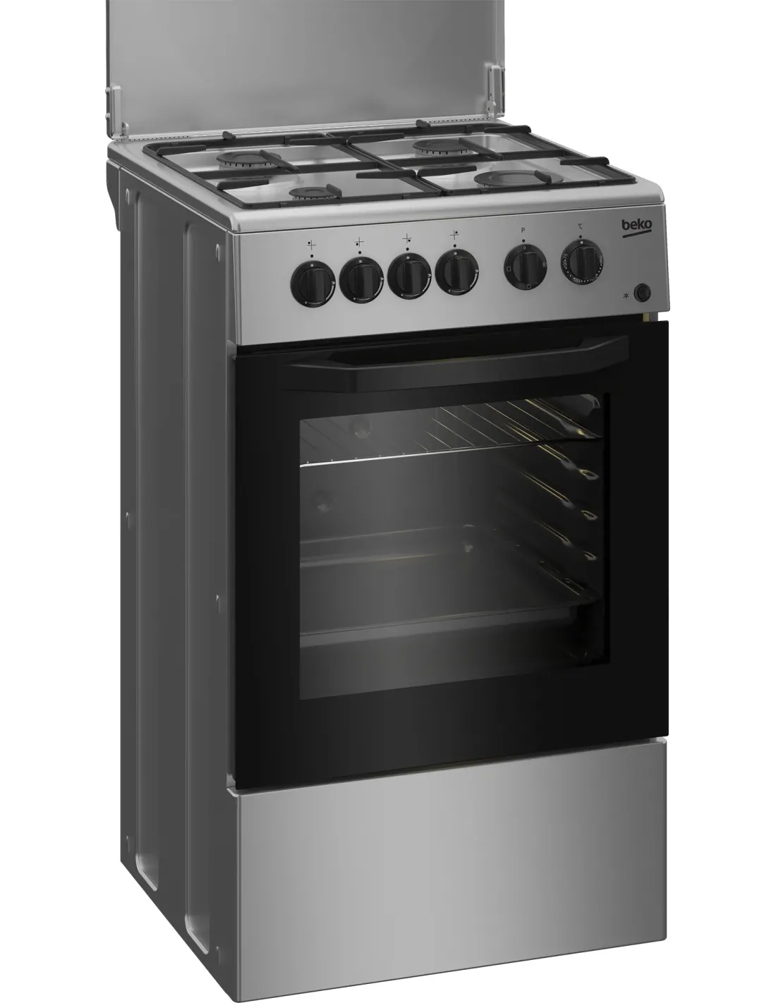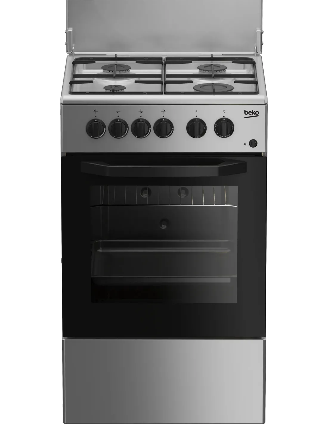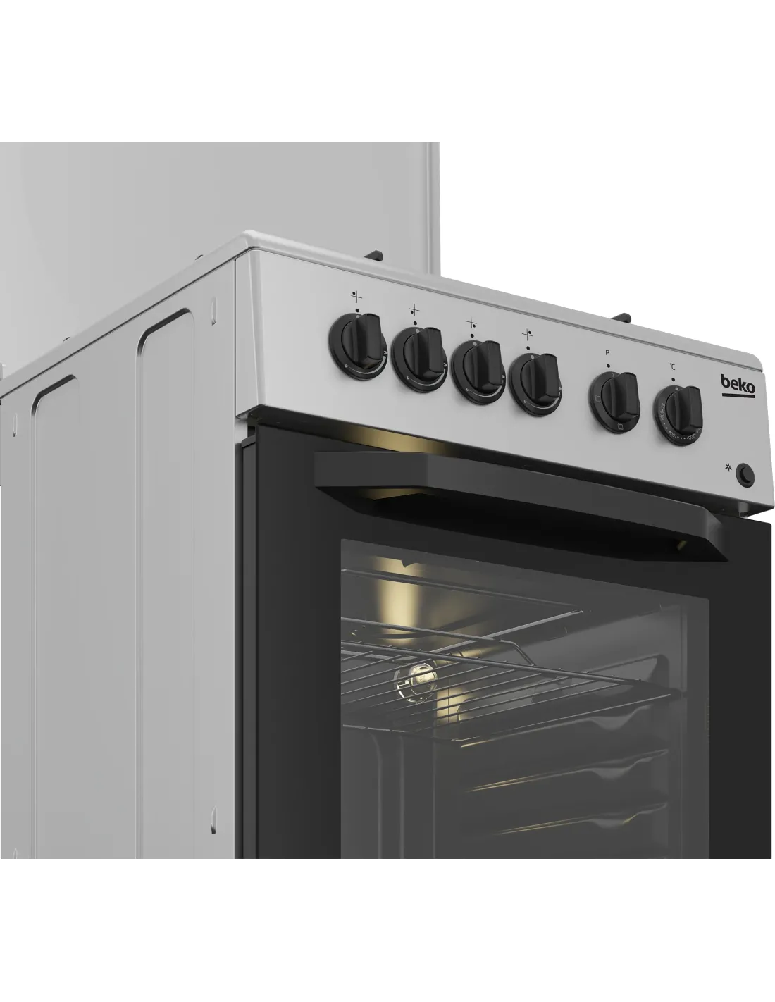Beko CSS 42014 FS: Cucina Elettrica Statica, 50x50 cm. Tipo di prodotto: Cucina, Colore del prodotto: Nero, Argento, Tipo di controllo: Manopola. Tipo di piano cottura: Gas, Numero totale di fuochi: 4 Fornello(i), Tipo di gas: Gas naturale (NG). Dimensione del forno: Media, Sorgente di alimentazione del forno: Elettrico, Capacità netta del forno: 54 L. Classe efficienza energetica: A, Consumo energetico (convenzionale): 0,74 kWh, Potenza aggregata (elettrica): 1900 W. Larghezza: 500 mm, Profondità: 500 mm, Altezza: 850 mm