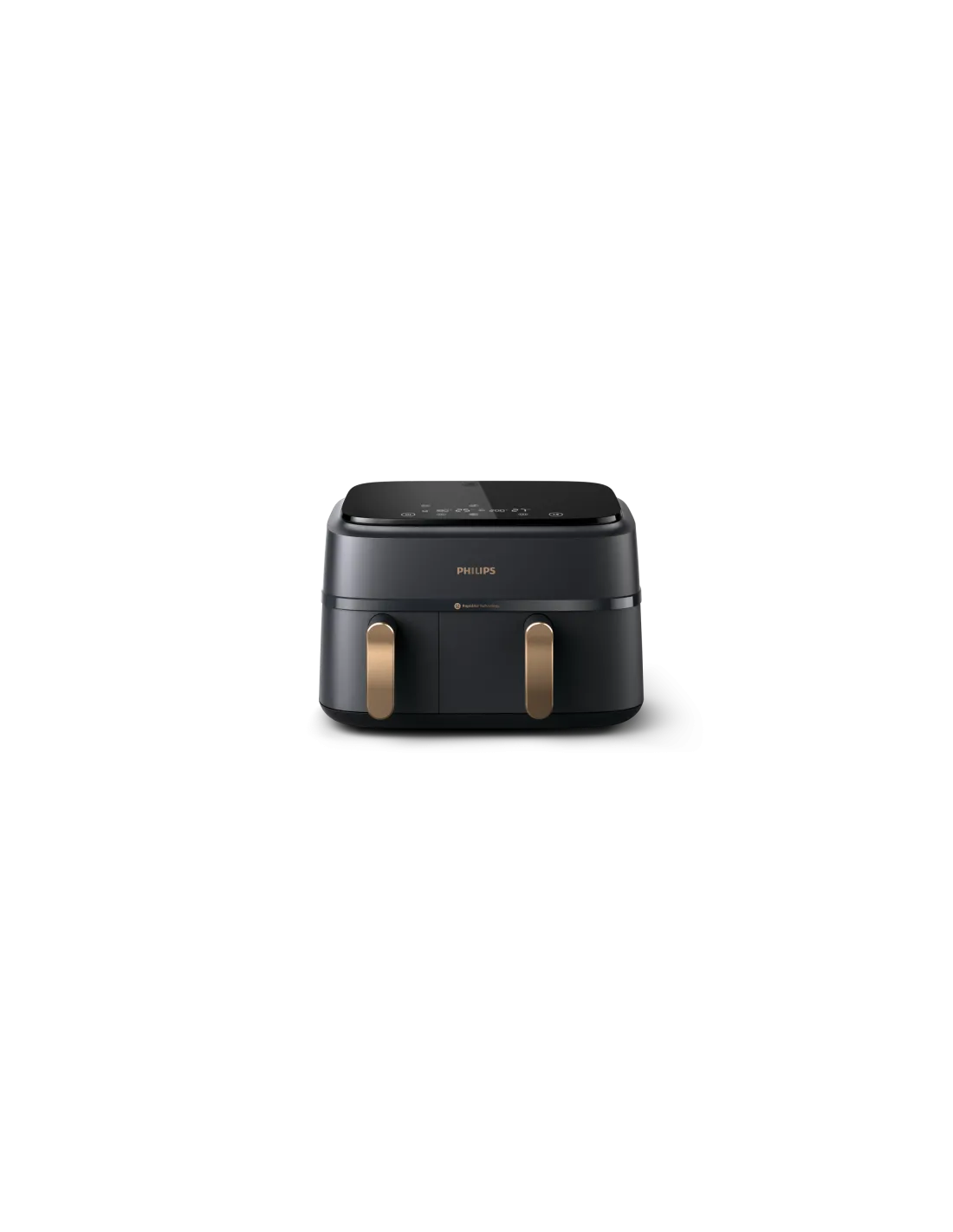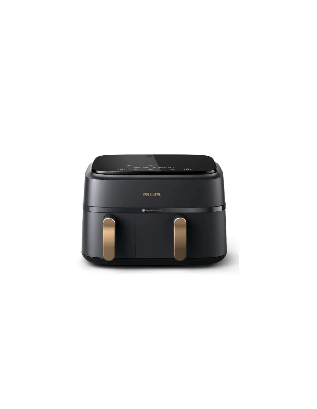 Philips Serie 3000 Airfryer doppio cestello, friggitrice ad aria da 9.0L, 12 metodi di cottura, App per ricette NA352/00. Tipo di prodotto: Friggitrice ad aria calda, Capacità: 9 L, Capacità friggitrice: 1,5 kg. Tipo di costruzione: Doppia, Colore del prodotto: Nero, Bronzo, Tipo di controllo: Touch. Tipo di display: LED. Potenza: 2750 W, Tensione di ingresso AC: 220-240 V, Frequenza di ingresso AC: 50 Hz. Larghezza: 382,5 mm, Profondità: 443,9 mm, Altezza: 314,2 mm