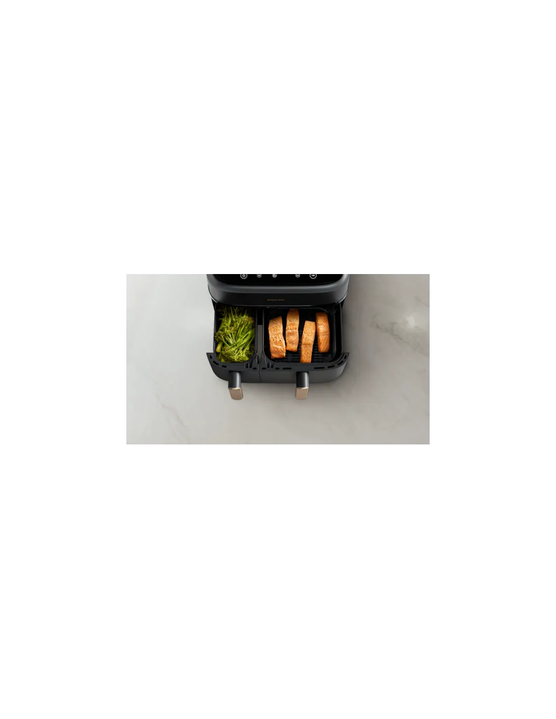 Airfryer Philips con doppio cestello Serie 3000 consente la preparazione di due piatti caldi e pronti contemporaneamente. Gusta una cucina sana e deliziosa: hai a disposizione un cestello grande per realizzare primi piatti in grandi quantità e uno piccolo per contorni o pasti per una persona.