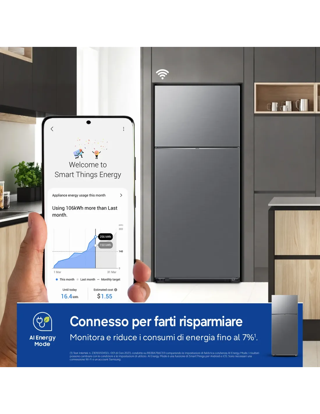 | Tecnologie Samsung (conservazione alimenti) | Modalità AI Energy, Digital Inverter Compressor, Impostazione vacanze, Multi Flow, PowerFreeze, Total No Frost, Twin Cooling, Twin Cooling Plus™, WiFi |