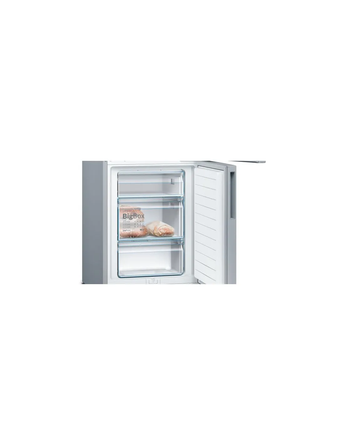 Bosch Serie 4 KGV39VLEAS Frigorifero Combinato da libera installazione 201 x 60 cm Metal look Classe E. Capacità netta totale: 343 L. Cerniera porta: Destra. Classe climatica: SN-T, Emissione acustica: 39 dB. Capacità netta frigorifero: 249 L, Luce interna, Numero di ripiani frigorifero: 4, Numero di cassetti per verdura: 1. Capacità netta congelatore: 94 L, Capacità di congelamento: 7 kg/24h. Classe efficienza energetica: E, Consumo energetico annuo: 233 kWh. Colore del prodotto: Acciaio inox