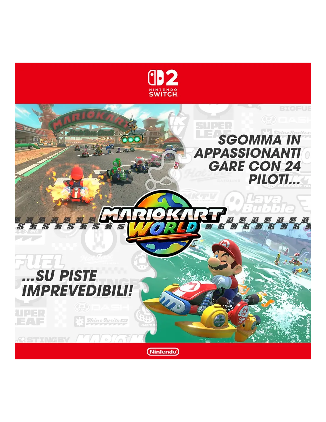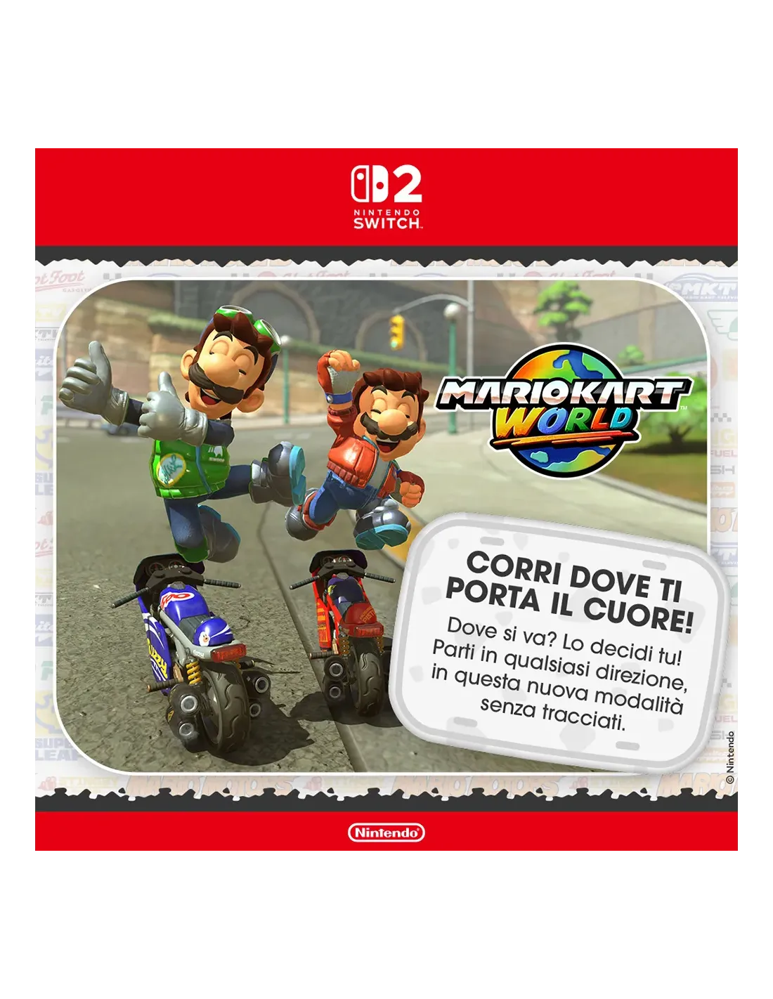 Guida senza limiti con Mario e i suoi amici! Sfreccia tra i percorsi di un vasto mondo dove ogni luogo è collegato. Gareggia tra verdi pianure, vivaci città, vasti specchi d’acqua, vulcani antichi e... tutto quello che c’è in mezzo! In esclusiva per Nintendo Switch 2!