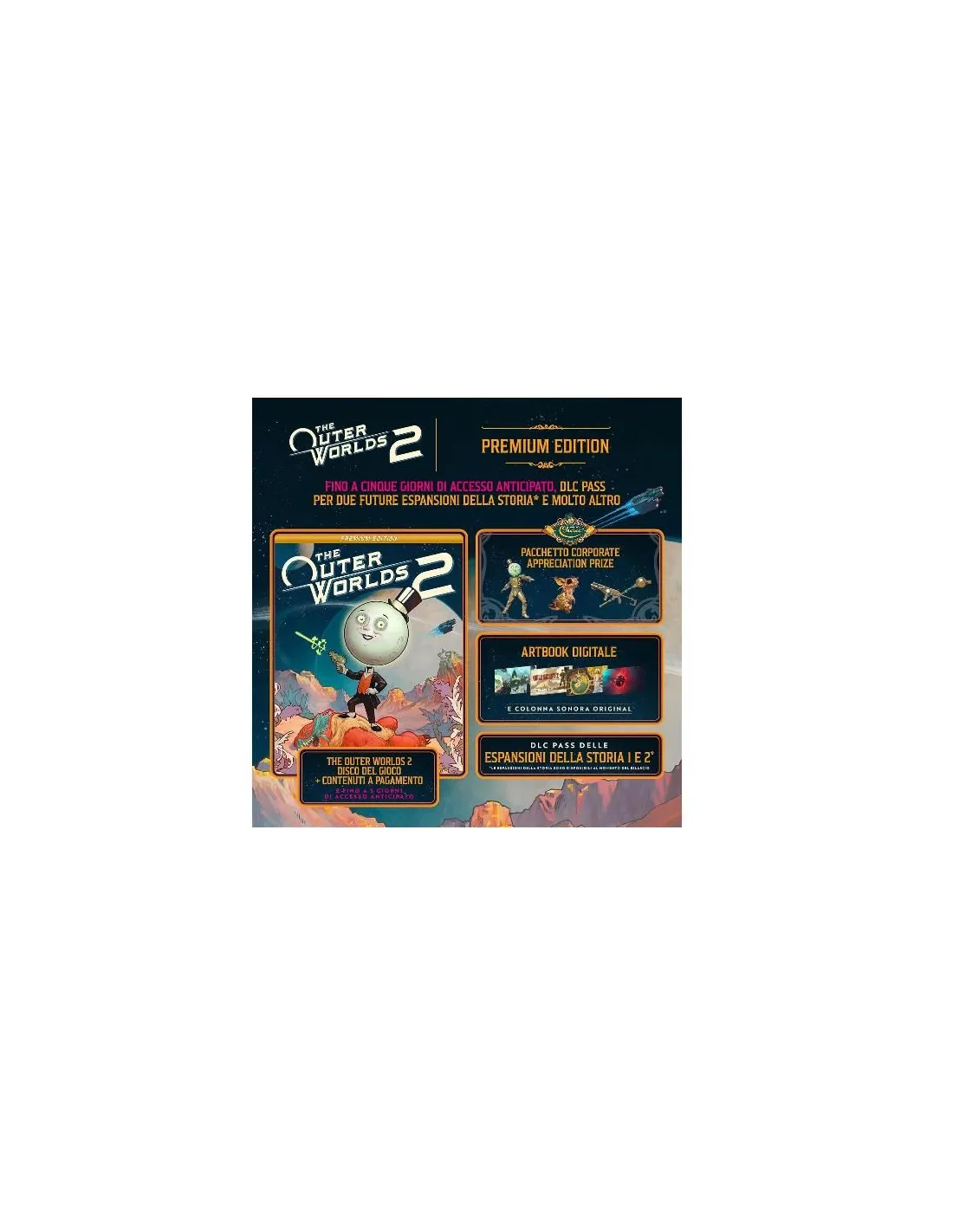 La Premium Edition include: il gioco base The Outer Worlds 2, fino a cinque giorni di accesso anticipato, il DLC Pass per due future espansioni della storia, il pacchetto Moon Man's Corporate Appreciation Premium Prize e l'accesso all'artbook digitale e alla colonna sonora originale.