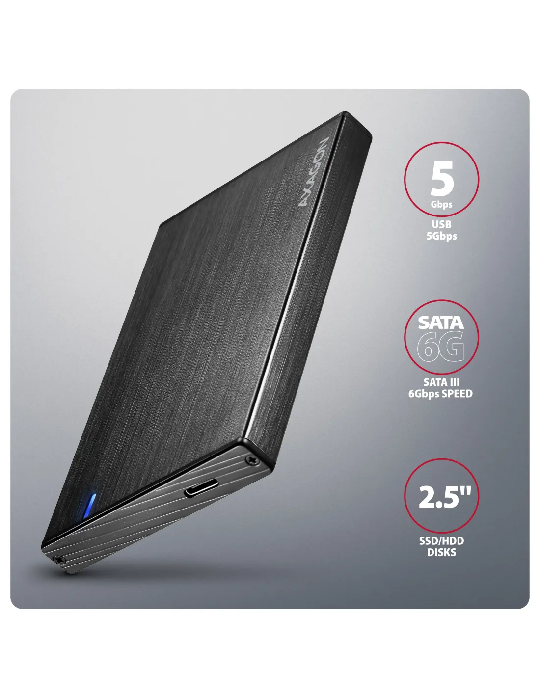 Axagon EE25-XA6C. Tipo di prodotto: Box esterno HDD/SSD. numero di dispositivi di archivio supportati: 1, Dimensione del dispositivo di archiviazione: 2.5", Interfacce dell'unità di archiviazione supportate: SATA, Seriale ATA II, Serial ATA III. Velocità di trasferimento dati: 5 Gbit/s. Colore del prodotto: Nero. Connettore USB: USB tipo-C
