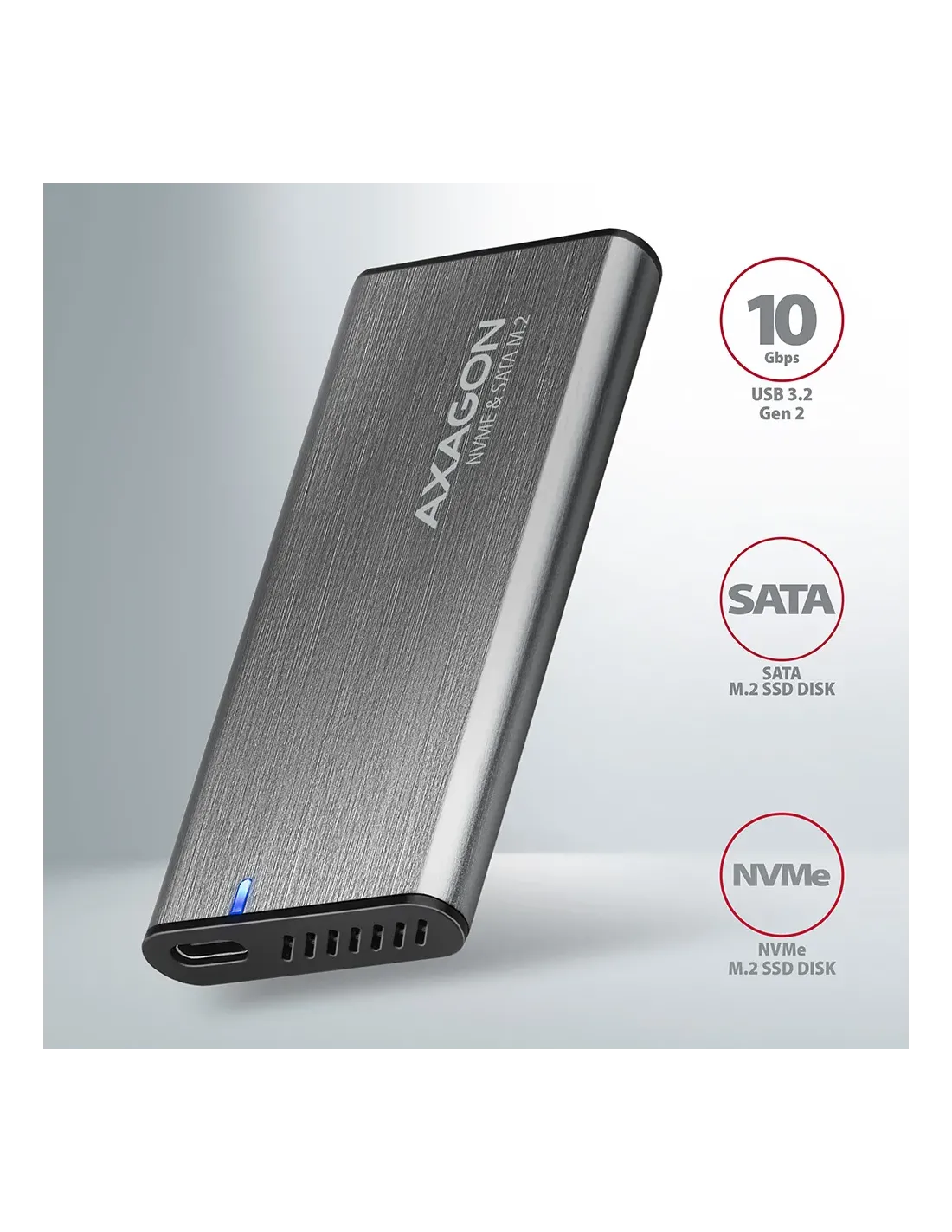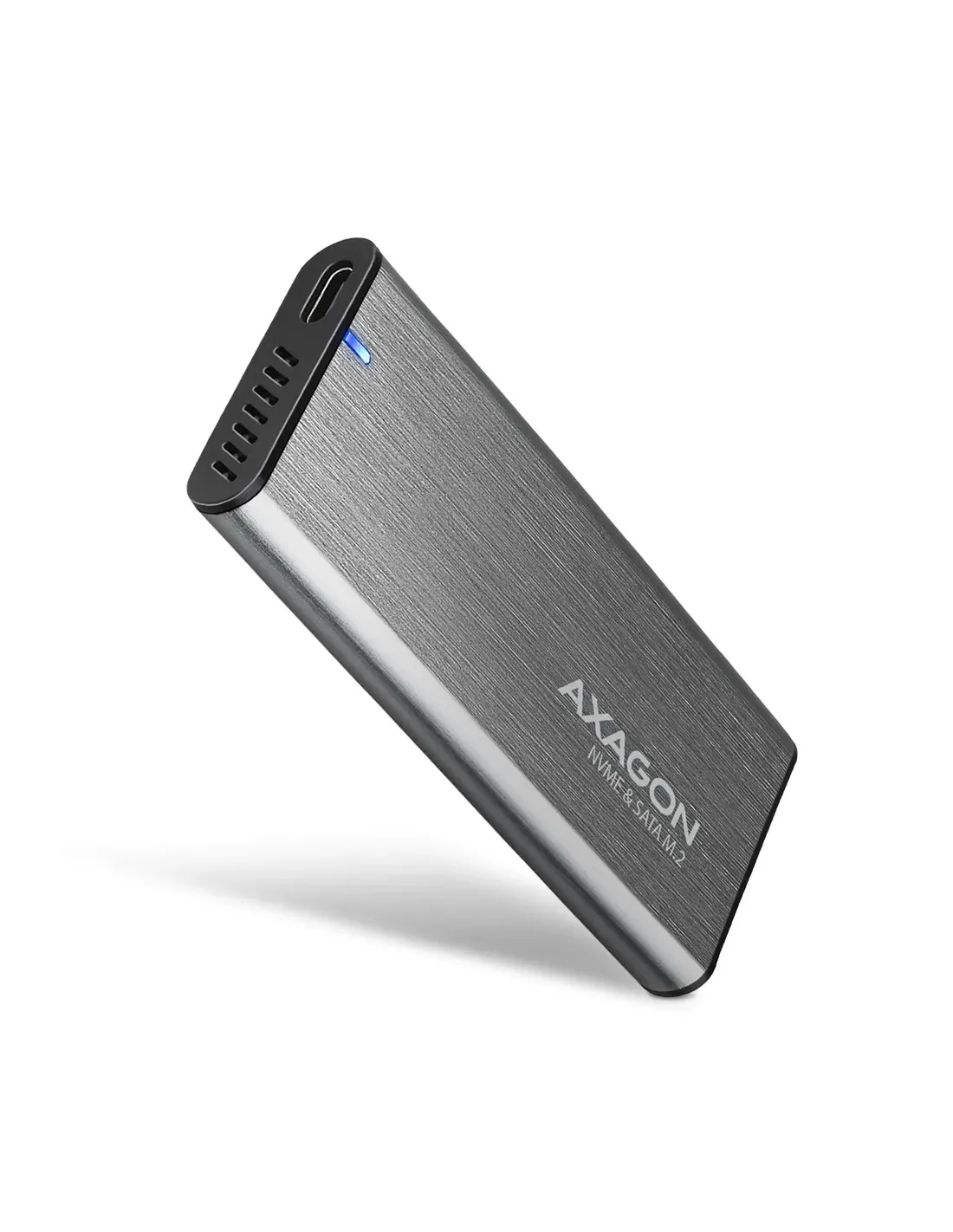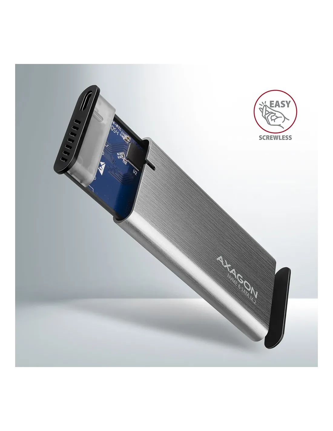 Axagon EEM2-SG2. Tipo di prodotto: Box esterno SSD. numero di dispositivi di archivio supportati: 1, Dimensione del dispositivo di archiviazione: M.2, Interfacce dell'unità di archiviazione supportate: NVMe-oF, SATA, Seriale ATA II, Serial ATA III. Velocità di trasferimento dati: 10 Gbit/s. Colore del prodotto: Grigio. Connettore USB: USB tipo-C