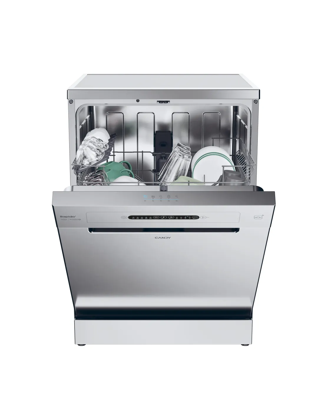 Candy RapidÓ CF 3E7L0S. Posizionamento dell'apparecchio: Libera installazione, Dimensione: Dimensione massima (60 cm), Colore della porta: Acciaio inox. Numero di coperti: 13 coperti, Classe emissione rumore: C, Emissione acustica: 47 dB. Applicazioni per il controllo supportate: hOn. Classe efficienza energetica: E, Consumo di acqua per ciclo: 10,9 L, Consumo energetico per 100 cicli: 93 kWh. Larghezza: 597 mm, Profondità: 598 mm, Altezza: 850 mm