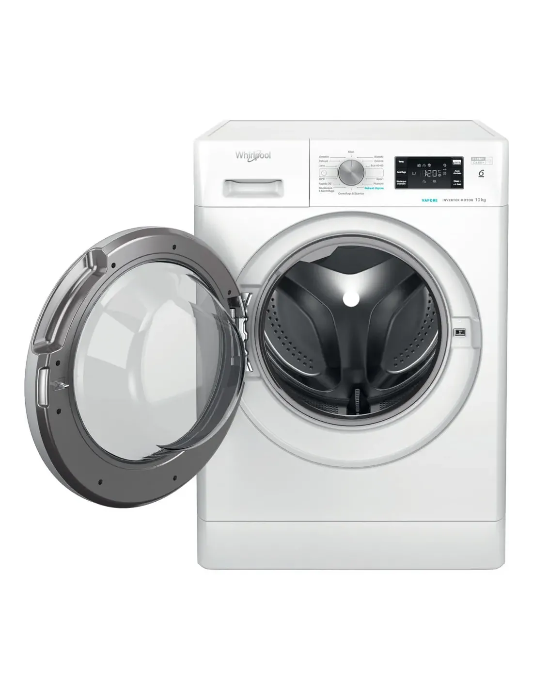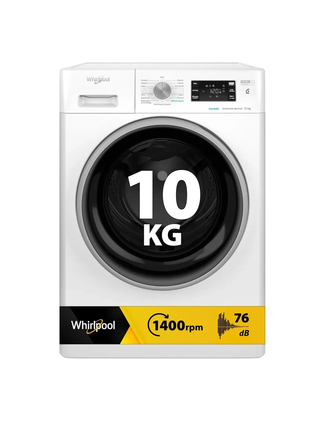 Whirlpool Lavatrice a libera installazione - FFB 1048 BSV IT. Tipo di carica: Caricamento frontale. Capacità cestello: 10 kg, Classe di efficienza della centrifuga: B, Silenziosità (centrifuga): 76 dB, Velocità di centrifuga massima: 1400 Giri/min. Colore del prodotto: Bianco. Larghezza: 595 mm, Profondità: 605 mm, Altezza: 850 mm. Classe efficienza energetica: A