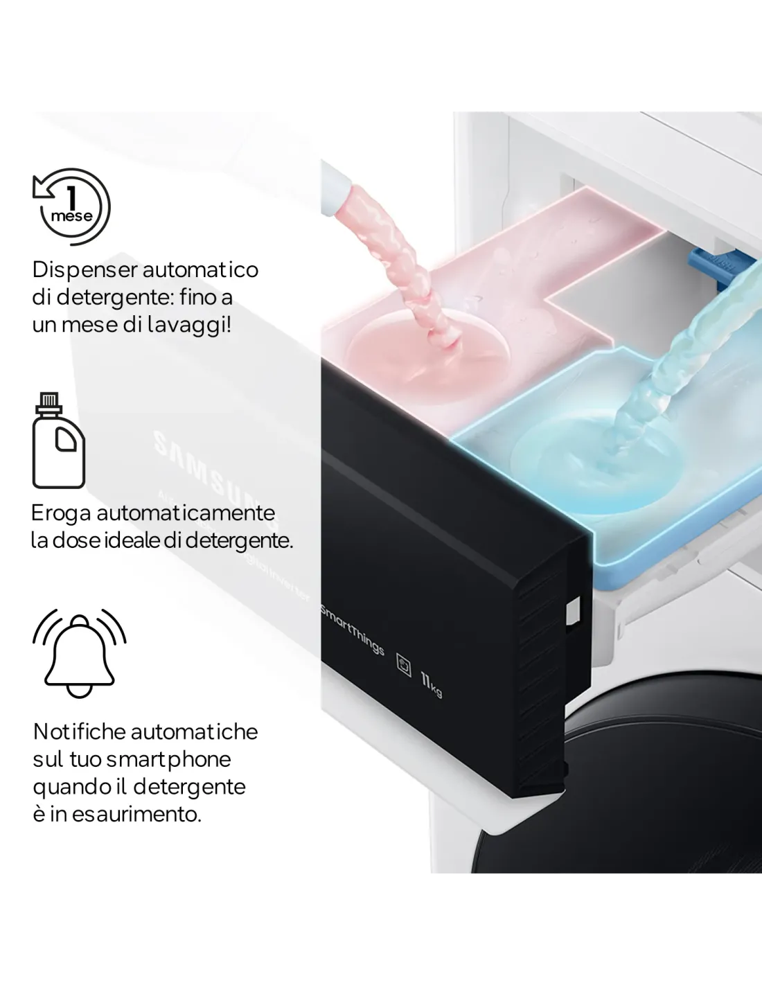 | Tecnologie Samsung (cura dei vestiti) | Controllo AI, AI EcoBubble, AI Wash, BubbleSoak™, Drum Clean+, SmartThings, Cassetto StayClean, Super Speed |