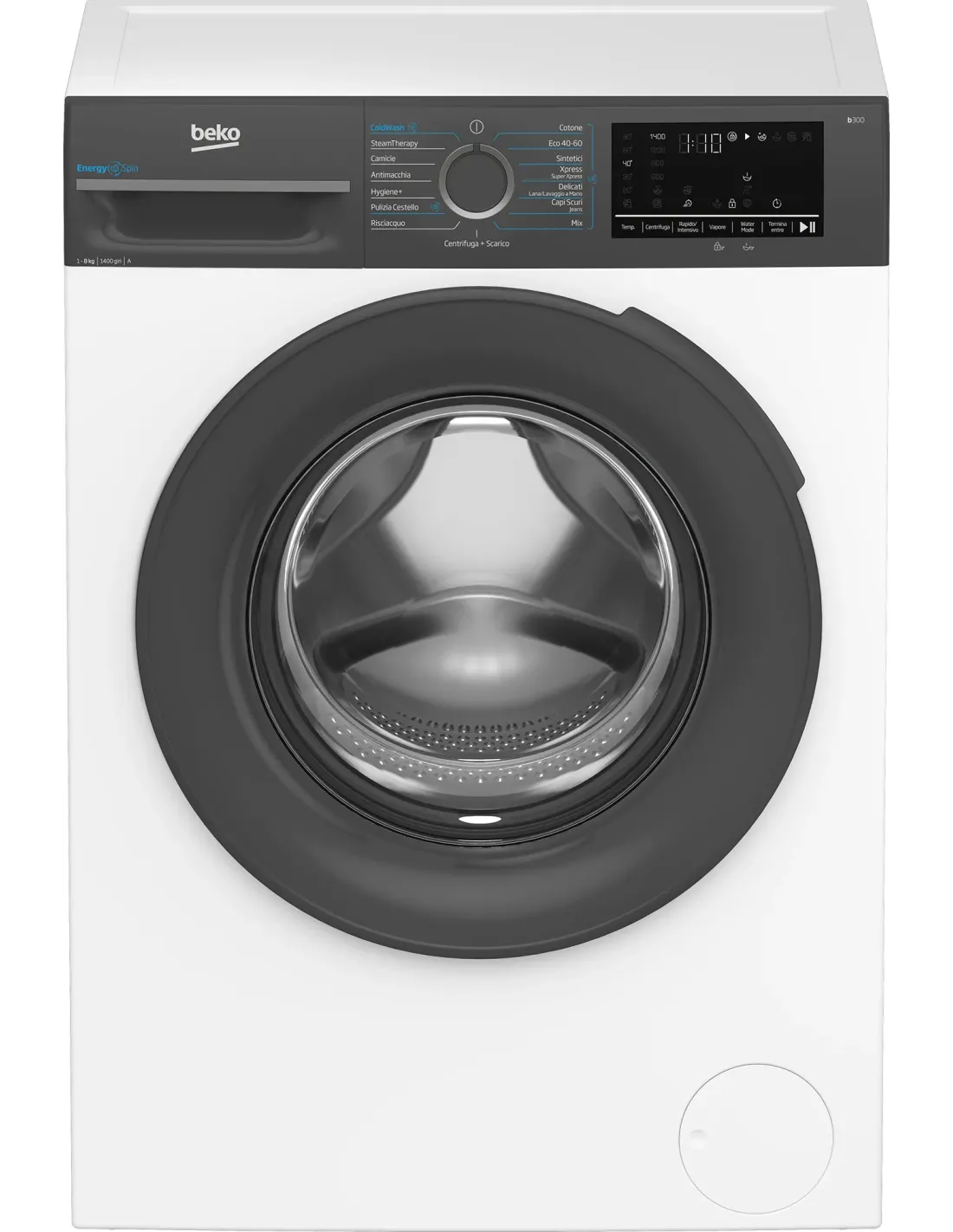 Beko b300 BMWEU8147DA: Lavatrice 8kg, classe A-10%, 1400giri, linea estetica NX, motore inverter, Display Touch, colore Bianco, oblò Antracite, tecnologia EnergySpin™, funzione a vapore SteamCure™, Caricamento frontale, 8 kg, B, 76 dB, 1351 Giri/min, A