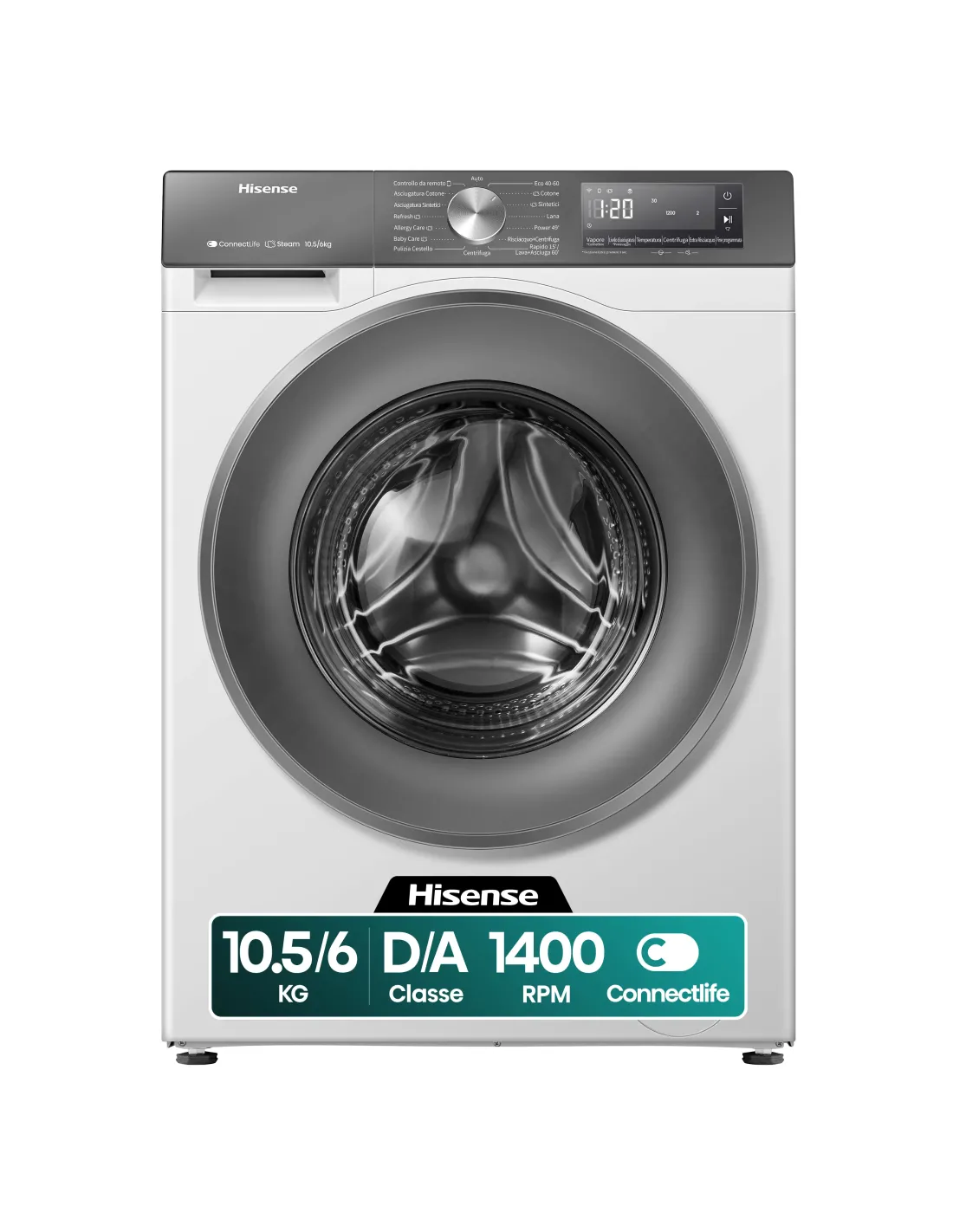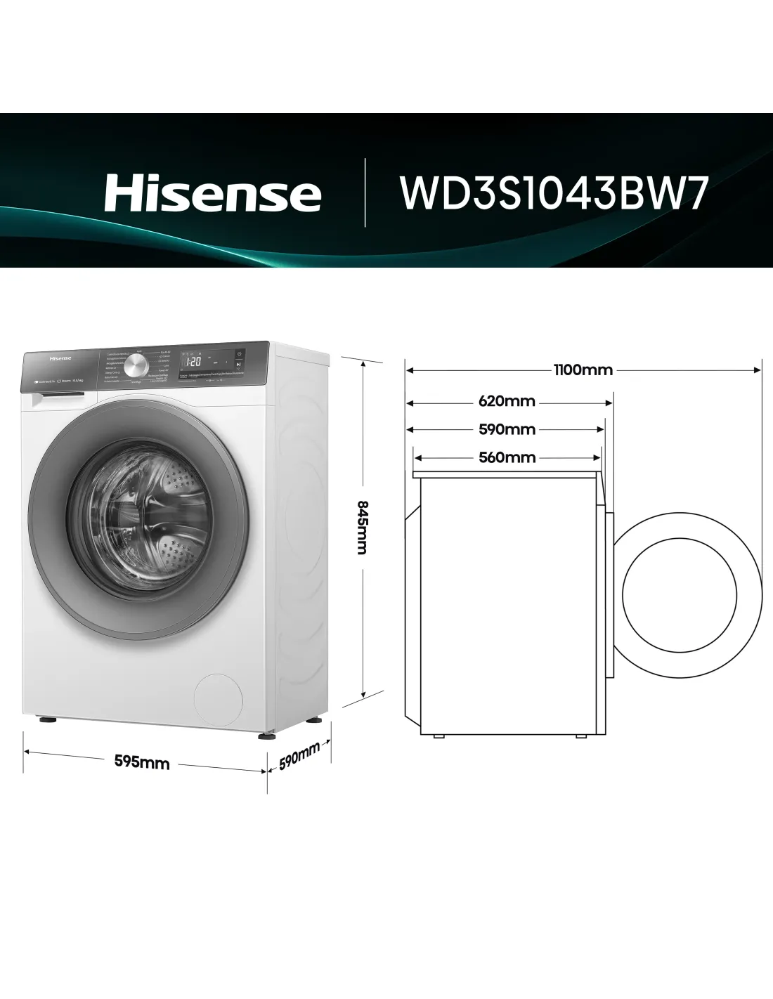 Hisense WD3S1043BW7. Tipo di carica: Caricamento frontale, Posizionamento dell'apparecchio: Libera installazione, Colore del prodotto: Bianco. Capacità di asciugatura: 6 kg, Velocità di centrifuga massima: 1400 Giri/min, Classe di efficienza della centrifuga: B. Angolo di apertura della porta: 135°. Classe di efficienza energetica (lavaggio): A, Classe di efficienza energetica( lavaggio e asciugatura): D, Consumo di acqua (lavaggio): 43 L. Profondità: 590 mm, Larghezza: 595 mm, Altezza: 845 mm
