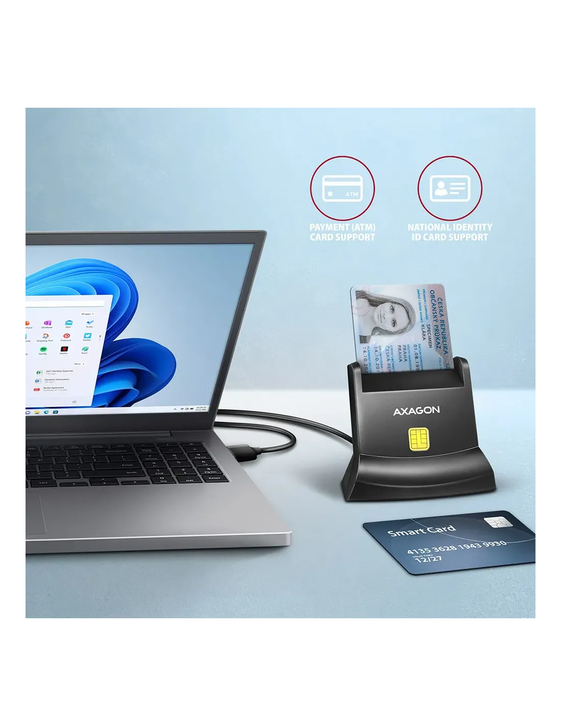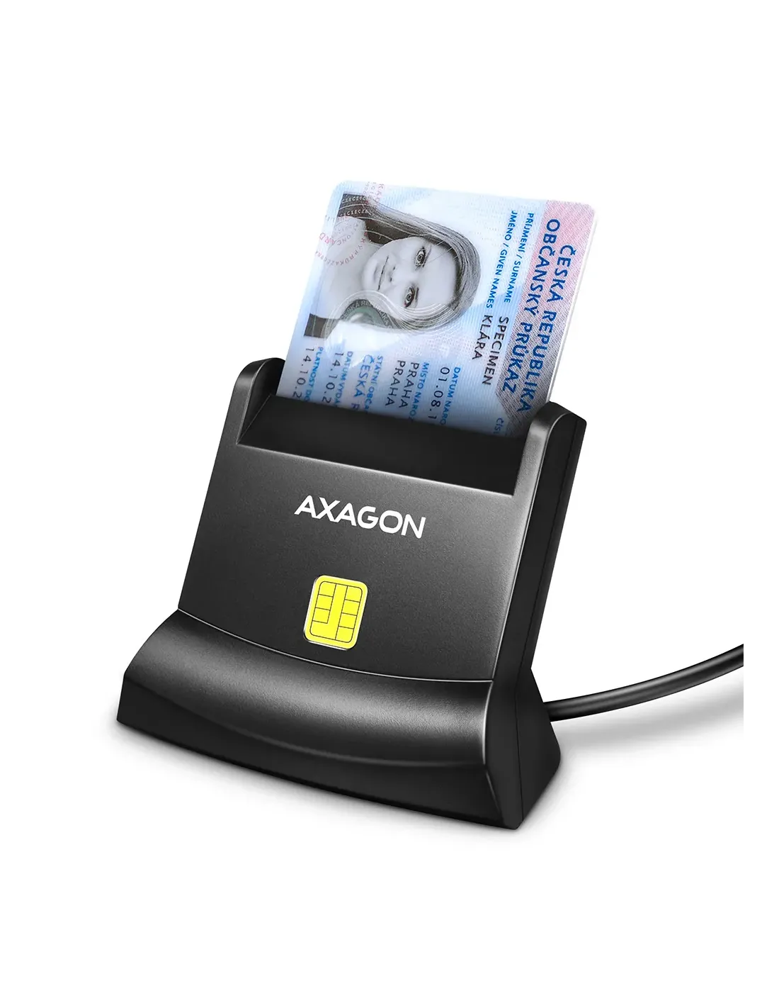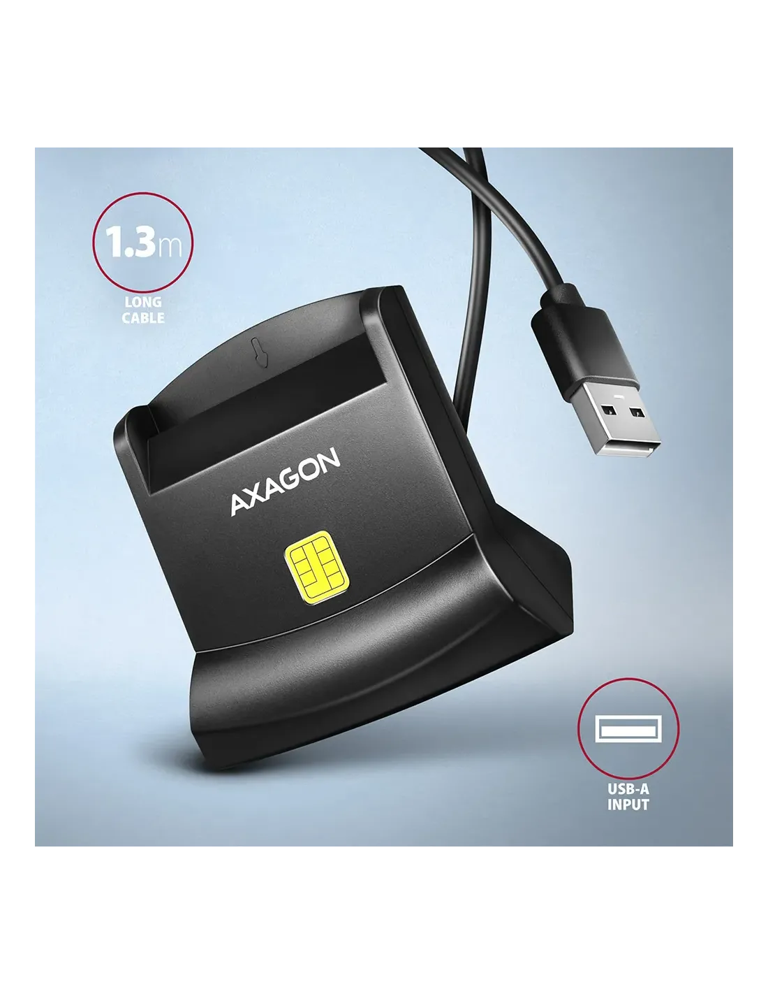 Axagon Universal desktop USB contact Smart/ID card reader with long USB-A cable. Suitable for the eObanka application.. Interfaccia: USB 2.0. Lunghezza cavo: 1,3 m, Colore del prodotto: Nero. Peso: 82 g