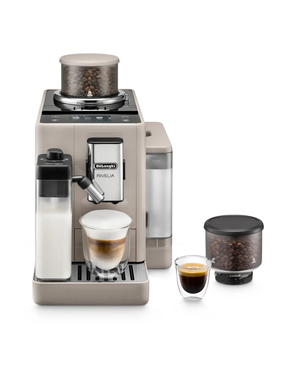 RIVELIA MILK. Macchina automatica per caffè in chicchi De'Longhi, tecnologia brevettata “LatteCrema Hot" per montare cremose e dense schiume di latte calde, esclusiva tecnologia "Bean Switch System" per cambiare varietà di chicchi all'istante alternando tra due diversi contenitori di chicchi da 250 gr, “Bean Adapt Technology" per regolare automaticamente il grado di temperatura e livello di aroma ottimale, 16 bevande di caffè e latte erogabili, display a colori full-touch TFT 3,5", 4 profili utente con funzionalità "Coffee Routines", funzione "Extra shot" per una maggiore intensità, funzionamento con grani e con polvere, macinacaffè integrato e regolabile fino a 13 livelli di macinatura, regolazione della temperatura, della quantità di caffè e di acqua, Thermoblock, durezza dell’acqua e spegnimento automatico programmabili, pulizia automatica della caraffa latte, colore sand beige.