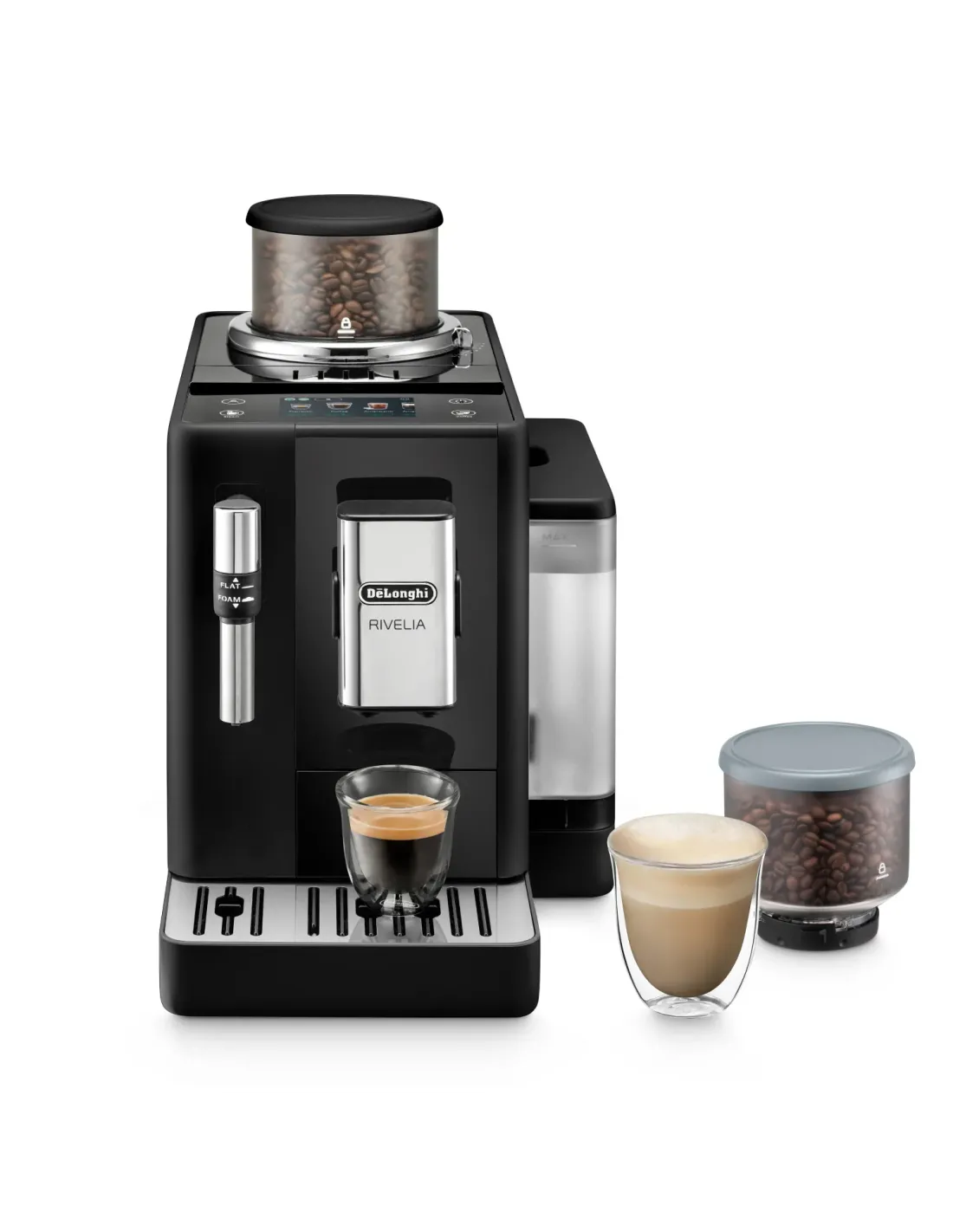 RIVELIA COFFEE. Macchina automatica per caffè in chicchi De'Longhi, Cappuccinatore manuale per una facile preparazione di una densa schiuma latte, esclusiva tecnologia "Bean Switch System" per cambiare varietà di chicchi all'istante alternando tra due diversi contenitori di chicchi da 250 gr, “Bean Adapt Technology" per regolare automaticamente il grado di temperatura e livello di aroma ottimale, 8 bevande di caffè, display a colori full-touch TFT 3,5", 4 profili utente con funzionalità "Coffee Routines", funzione "Extra shot" per una maggiore intensità, funzionamento con grani e con polvere, macinacaffè integrato e regolabile fino a 13 livelli di macinatura, regolazione della temperatura, della quantità di caffè e di acqua, Thermoblock, durezza dell’acqua e spegnimento automatico programmabili, pulizia automatica della caraffa latte, colore onyx black.