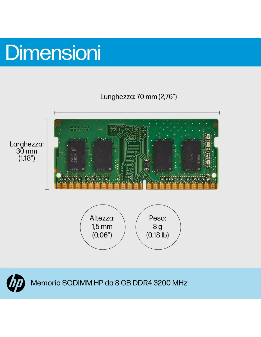 HP Memoria SODIMM 3200 DDR4 da 8 GB. Segmento HP: Business. Sistema operativo Windows supportato: Windows 10, Windows 11. Larghezza: 70 mm, Profondità: 30 mm, Altezza: 1,5 mm. Larghezza imballo: 232 mm, Profondità imballo: 148 mm, Altezza imballo: 10 mm. Peso del pallet: 183,8 kg, Numero di scatole per strato: 20 pz, Numero di cartoni per pallet: 100 pz