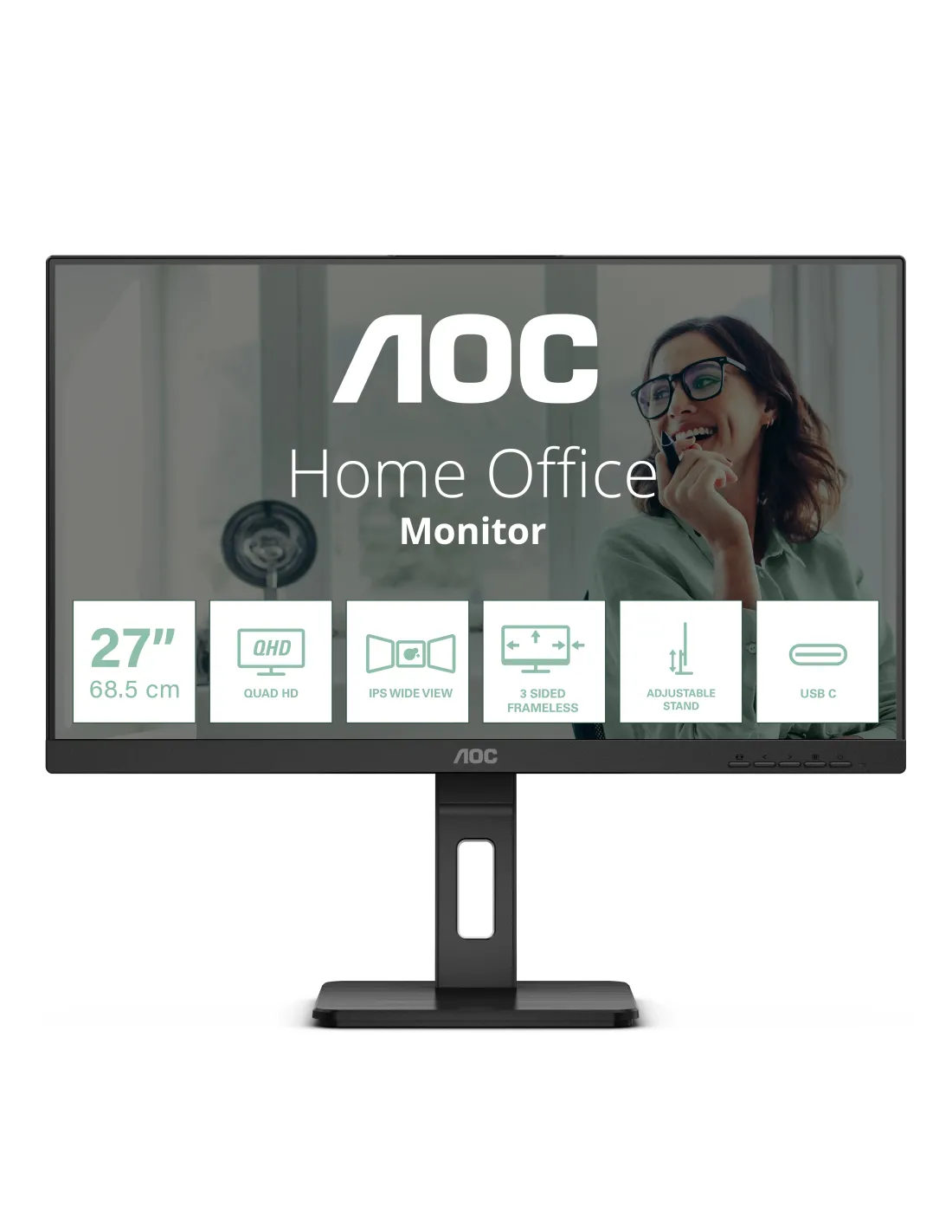 AOC Q27P3CV. Dimensioni diagonale schermo: 68,6 cm (27"), Risoluzione del display: 2560 x 1440 Pixel, Tipologia HD: Quad HD, Tecnologia display: LED, Tempo di risposta: 4 ms, Rapporto d'aspetto nativo: 16:9, Angolo di visualizzazione (orizzontale): 178°, Angolo di visualizzazione (verticale): 178°. Altoparlanti incorporati. Hub USB integrato, Versione dell'hub USB: 3.2 Gen 1 (3.1 Gen 1). Montaggio standard VESA, Regolazione altezza. Colore del prodotto: Nero