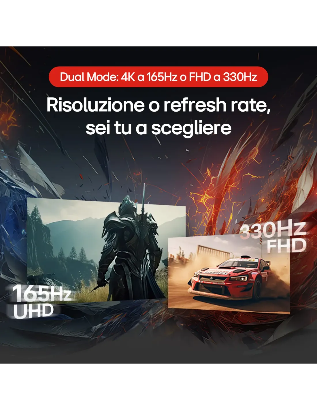 Metti da parte i compromessi, gioca sempre al massimo. Con la funzione Dual Mode, passa senza interruzioni da 4K 165Hz, pensato per giochi graficamente ricchi, a FHD 330Hz, ideale per titoli FPS e MOBA.