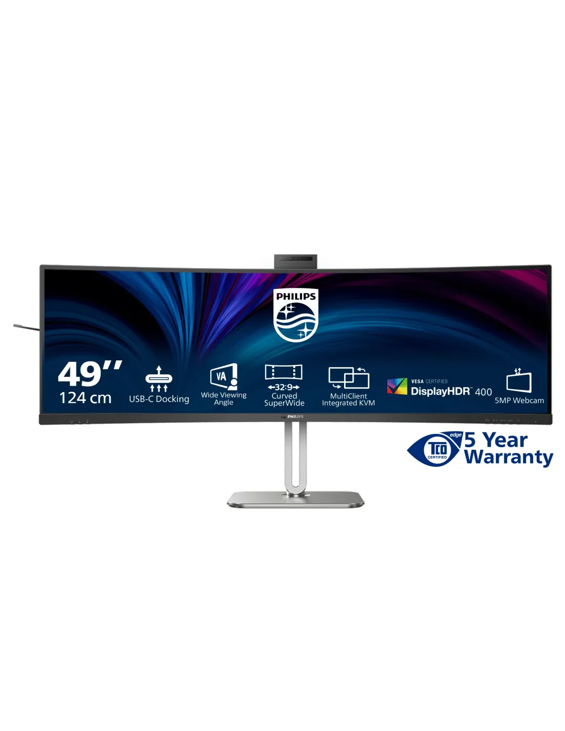 Philips Serie 5000 49B2U5900CH/00. Dimensioni diagonale schermo: 124 cm (48.8"), Risoluzione del display: 5120 x 1440 Pixel, Tipologia HD: Dual QHD, Tecnologia display: LCD, Tempo di risposta: 4 ms, Rapporto d'aspetto nativo: 32:9, Angolo di visualizzazione (orizzontale): 178°, Angolo di visualizzazione (verticale): 178°. Altoparlanti incorporati. Hub USB integrato, Versione dell'hub USB: 3.2 Gen 1 (3.1 Gen 1). Montaggio standard VESA, Regolazione altezza. Colore del prodotto: Nero
