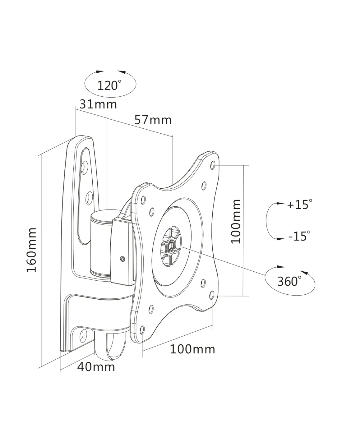 InLine montaggio a parete, per TFT fino a 69cm (27"), max. 15kg. Peso massimo (capacità): 15 kg, Capienza minima dimensioni dello schermo: 33 cm (13"), Capienza massima dimensioni dello schermo: 33 cm (13"), Compatibilità interfaccia di montaggio (min): 75 x 75 mm, Compatibilità interfaccia di montaggio (max): 100 x 100 mm. Inclinazione: -15 - 15°, Angolo di rotazione: -60 - 60°, Distanza dal muro (massima): 8,8 cm. Colore del prodotto: Nero