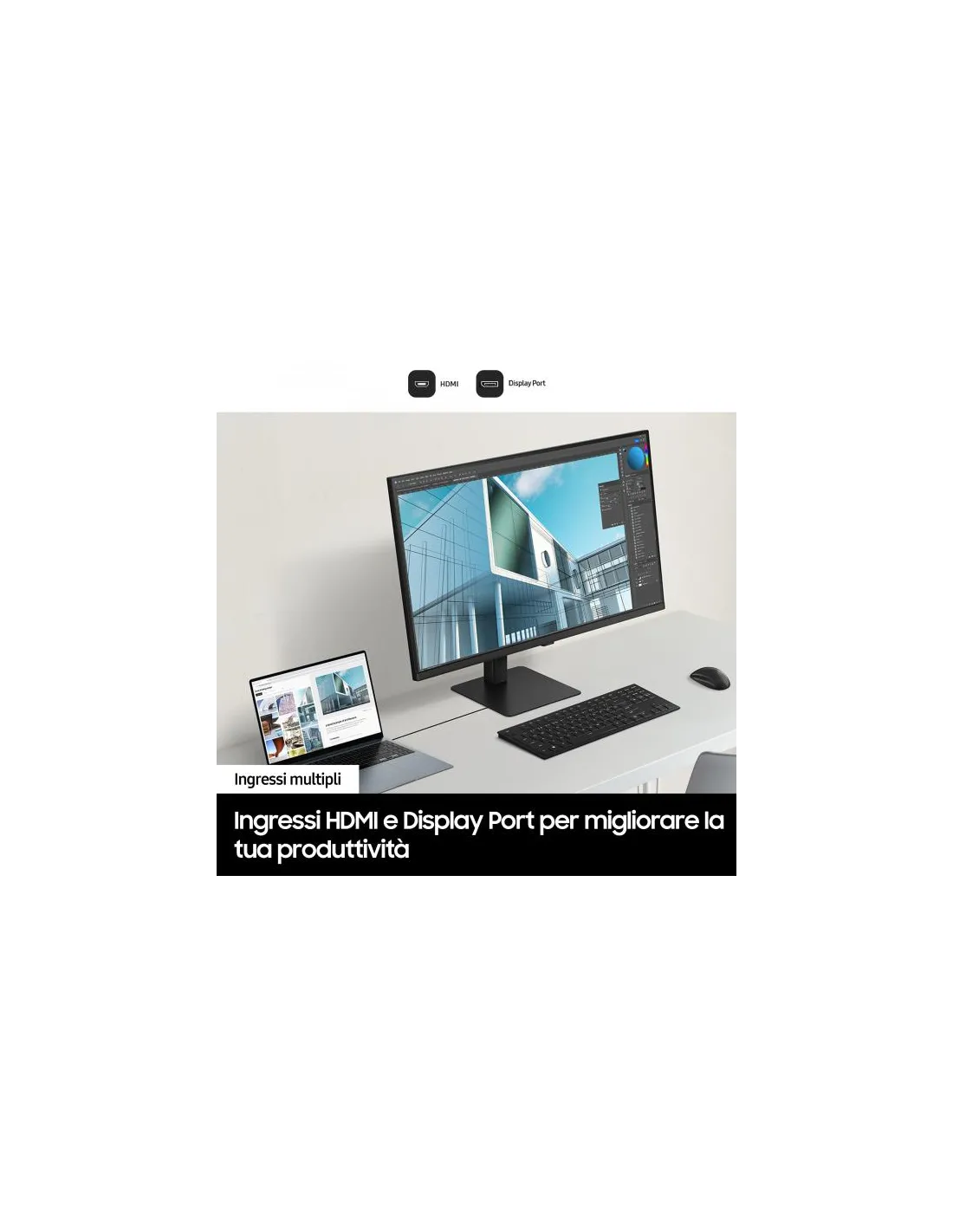 1.07 miliardi di colori con l'HDR10.Il gamut più ricco regala una precisione dell'immagine e dettagli spettacolari. L’HDR10 accentua le tonalità scure ed esalta la luminosità di quelle brillanti, con sfumature pressoché infinite e colori realistici. Ogni contenuto è una gioia per gli occhi e può essere vissuto esattamente come previsto.Più porte a disposizione.Grazie alle porte HDMI e DP, collegare le periferiche sarà più semplice che mai. Un sistema incredibilmente pratico per semplificare la procedura di installazione, aumentando la produttività e assicurando un flusso di lavoro continuo senza interruzioni.Easy Setup Stand.Con Easy Setup Stand potrai dare vita a uno spazio di lavoro su misura per te senza alcun bisogno di viti o attrezzi. È sufficiente premere un pulsante per cambiare configurazione.Sistema Intelligent Eye Care certificato TUV.Proteggi sia i tuoi occhi che il tuo schermo. Per i progetti delle ore piccole, luminosità e temperatura cromatica vengono ottimizzati automaticamente assicurando le condizioni ideali per il tuo ambiente di lavoro. Grazie al sistema Intelligent Eye Care certificato TUV, Samsung riduce lo sfarfallio dello schermo e protegge gli occhi da un eccesso di luce blu con la modalità Eye Saver.Progettati con attenzione.I monitor ViewFinity 2024 di Samsung* contengono almeno il 14%** di plastica riciclata. Inoltre, non vengono utilizzati spray chimici sulla plastica del monitor e viene utilizzata la colla al posto delle graffette nella giunzione della scatola di imballaggio, rendendo possibile il riciclo.