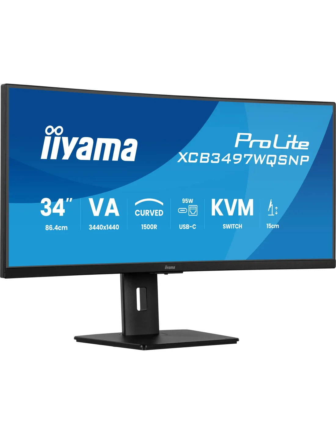iiyama ProLite XCB3497WQSNP-B1. Dimensioni diagonale schermo: 86,4 cm (34"), Risoluzione del display: 3440 x 1440 Pixel, Tipologia HD: UltraWide Quad HD, Tecnologia display: LED, Superficie display: Opaco, Rapporto d'aspetto nativo: 21:9, Angolo di visualizzazione (orizzontale): 178°, Angolo di visualizzazione (verticale): 178°. Altoparlanti incorporati. Hub USB integrato, Versione dell'hub USB: 3.2 Gen 1 (3.1 Gen 1). Montaggio standard VESA, Regolazione altezza. Colore del prodotto: Nero