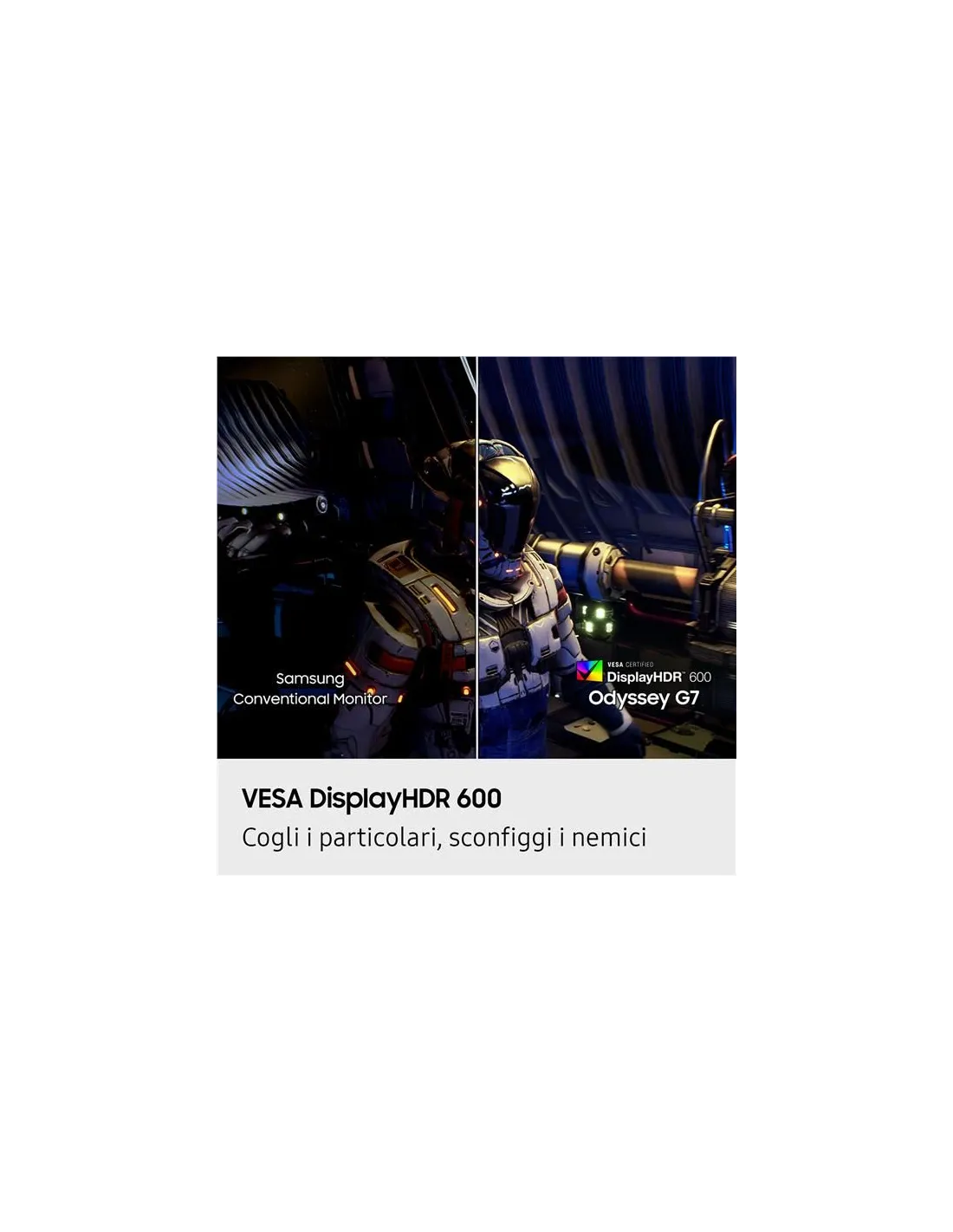 Samsung Monitor Gaming Odyssey G7 - G75F da 37" UHD CurvoAzioni di gioco fluide, senza interruzioniAMD FreeSync Premium ProOttieni una riproduzione incredibilmente fluida durante le azioni più rapide dei tuoi giochi grazie alla frequenza di aggiornamento variabile (VRR). AMD FreeSync Premium Pro sincronizza la GPU e il pannello riducendo le intermittenze, il ritardo dello schermo e leffetto tearing, per affrontare nel modo migliore anche sessioni di gioco intense.Collegamento automatico in un attimoAuto Source Switch+Con Auto Source Switch+ potrai iniziare subito a giocare senza più attese. Il monitor rileva subito se i dispositivi collegati sono accesi e attiva istantaneamente il segnale della nuova sorgente senza bisogno di trovare lingresso giusto ogni volta.La soluzione ideale per un'esperienza immersivaCoreSync & CoreLighting+Crea l'atmosfera giusta per ogni gioco. Grazie alla tecnologia CoreSync, luniverso di gioco prenderà vita con 16,7 milioni di colori. Con CoreLighting+ potrai creare un'atmosfera unica in cui immergerti completamente, con colori mai così realistici.Vinci ogni partita senza rinunciare alla comoditàSupporto ergonomicoIl trionfo è a portata di mano. Inclina e regola il monitor per avvistare fino allultimo nemico.Azioni di gioco fluide, senza interruzioniAMD FreeSync Premium Pro