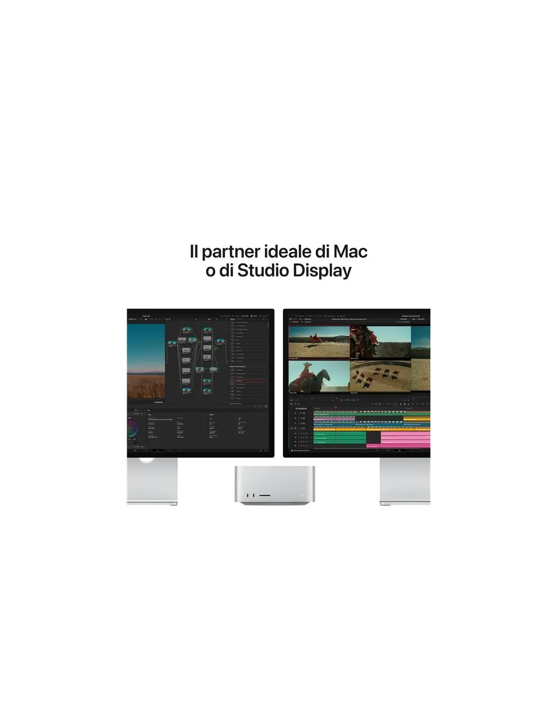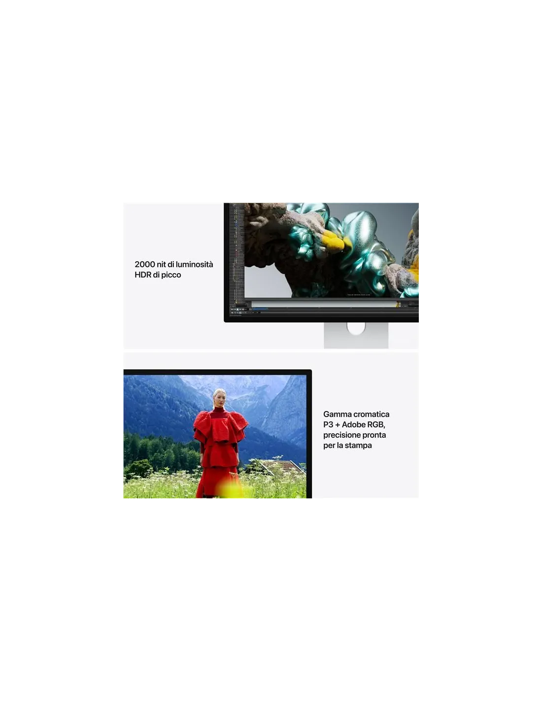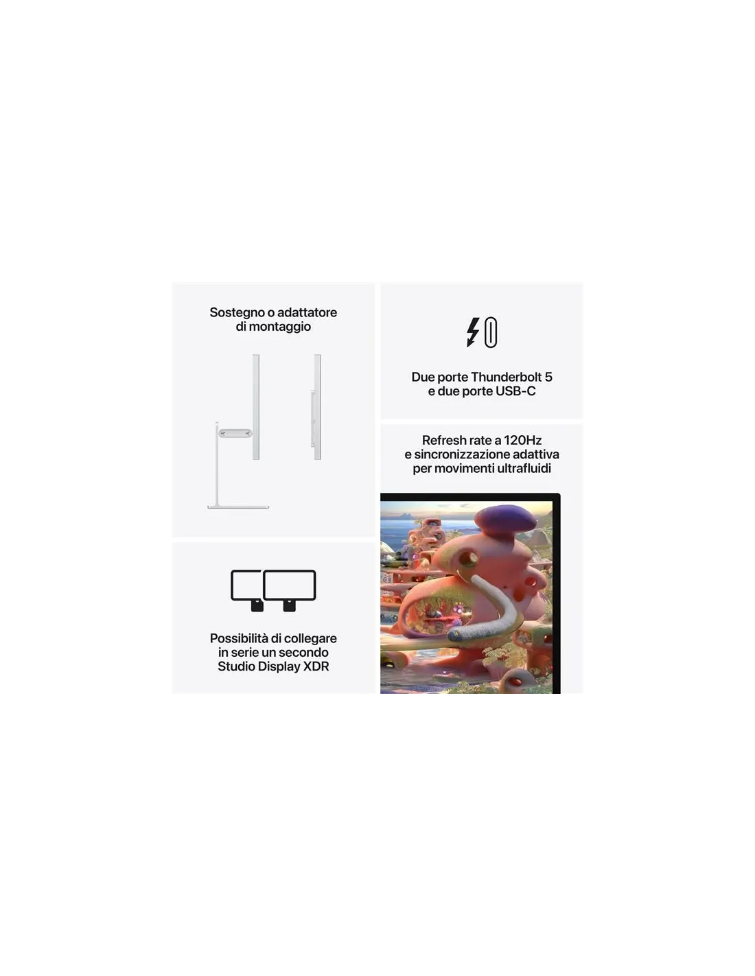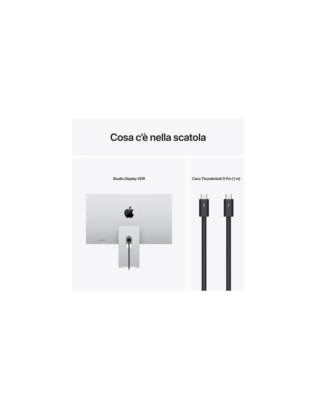 Apple Studio Display XDR - Vetro standard - Sostegno a altezza e inclinazione regolabileStudio Display XDR. I pixel sono tutti esaltati.Un display Retina XDR 5K da 27" che porta luminosità, colori e reattività a livelli mai visti. E con una videocamera, tre microfoni in array e un sistema audio a sei altoparlanti evoluti, e tutta la potenza della tecnologia Thunderbolt 5, è il massimo per chi crea in modo professionale.Caratteristiche principali - PIÙ BRILLANTE DI COSÌ — La retroilluminazione mini LED con 2304 zone di dimming riduce gli aloni luminosi. Fino a 1000 nit di luminosità SDR ti consentono di lavorare al meglio anche in pieno sole. E 2000 nit di luminosità HDR di picco aumentano il contrasto fra punti di luce e ombre. - UNA GAMMA DI COLORI ANCORA PIÙ AMPIA — Grazie alla possibilità di accedere agli spazi cromatici P3 e Adobe RGB, i colori risultano sempre incredibilmente accurati, dallo schermo alla stampa. E chi si occupa di video, fotografia e grafica ha a disposizione un’ampia varietà di modalità di riferimento. - MOVIMENTI ULTRAFLUIDI — Con il refresh rate a 120Hz tutto si muove in modo più armonioso. La sincronizzazione adattiva si regola al cambio di frame rate con un controllo preciso, per assicurare la massima reattività del movimento. - TANTE PORTE, TANTA POTENZA — Con due porte Thunderbolt 5 puoi connettere accessori ad alta velocità, ricaricare velocemente i portatili Mac o collegare in serie un secondo Studio Display XDR per ottenere un totale di 29 milioni di pixel. E hai anche due porte USB-C da usare per le periferiche USB o per ricaricare il tuo iPhone. - SEMPRE IL TUO LATO MIGLIORE — La videocamera Center Stage da 12MP ti fa apparire al meglio in qualsiasi condizione di luce durante le videochiamate. Con Panoramica Scrivania, puoi mostrare una vista dall’alto del tuo spazio di lavoro. E grazie ai tre microfoni di qualità professionale in array, la tua voce arriva sempre forte e chiara. - SEI ALTOPARLANTI. SEI DENTRO AL SUONO — I quattro woofer force cancelling producono bassi profondi e i due tweeter ad alte prestazioni ti danno medi precisi e acuti cristallini. E quando ascolti musica, guardi video o giochi ai videogame, l’audio spaziale crea un’esperienza acustica sofisticata. - DUE MODI PER EVITARE I RIFLESSI — Il rivestimento antiriflesso di serie riduce al minimo i bagliori. E se ti trovi in ambienti con luci molto forti, puoi scegliere il vetro con nanotexture che disperde la luce riducendo ulteriormente i riflessi. - SOSTEGNO INCLUSO — Studio Display XDR ha un sostegno a inclinazione e altezza regolabili che permette di inclinare lo schermo di 30° e di farlo scorrere su e giù di 105 mm in totale. Puoi anche scegliere un adattatore di montaggio VESA (opzionale).Qualità dell’immagine. La definizione definitiva.Il nuovissimo Studio Display XDR. Con luminosità, contrasto e colori incredibili, questo display Retina XDR 5K da 27" spinge ancora oltre la gamma dinamica estrema per darti immagini spettacolari e ultrarealistiche. È un monitor professionale, progettato per soddisfare le esigenze più impegnative di chi lavora nel cinema, nella produzione video, nella grafica e nel gaming. Gente che ha occhio.Più wow per ogni pro.Studio Display XDR è dotato di un sistema di calibrazione e di un’ampia gamma di modalità di riferimento: l’ideale per chi si occupa di video, fotografia e graphic design. E chi realizza effetti speciali o animazioni, oppure sviluppa videogiochi, si entusiasmerà per il maggiore livello di dettagli e reattività che il display dà a ogni lavoro.Pensi che tutto giri intorno a te? Esatto.Studio Display XDR ha una videocamera Center Stage da 12MP che offre una qualità delle immagini straordinaria e prestazioni ottimali anche con poca luce. Durante le videochiamate rimani sempre perfettamente al centro della scena, persino se ti muovi o se altre persone si uniscono a te. Panoramica Scrivania mostra contemporaneamente sullo schermo il tuo volto e una vista dall’alto del tuo spazio di lavoro. E la funzione Edge Light crea un anello di luce virtuale lungo il profilo del display, così il tuo viso risulta sempre ben illuminato.La tua voce in primo piano.Tre microfoni di qualità professionale in array mettono la tua voce al centro di videochiamate e registrazioni vocali. E grazie al beamforming direzionale, chi ascolta sentirà le tue parole, non quello che succede intorno a te.Sei altoparlanti. Sei dentro al suono.Sistema a sei altoparlanti. I quattro woofer force-cancelling producono bassi profondi, e i due tweeter ad alte prestazioni ti danno medi precisi e acuti cristallini. È un sistema di altoparlanti ad altissima fedeltà, il migliore mai creato per un Mac.