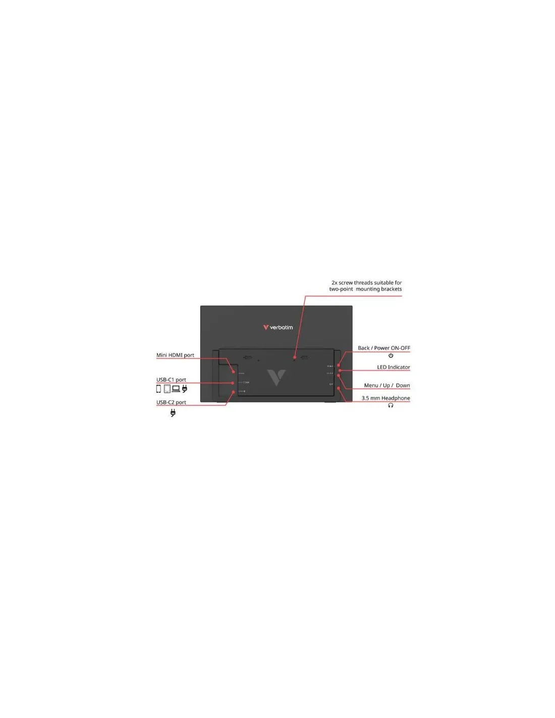 Verbatim Portable 15.6" FHD Touch Monitor LIGHT. Dimensioni diagonale schermo: 39,6 cm (15.6"), Tecnologia display: LCD, Risoluzione del display: 1920 x 1080 Pixel. Potenza in uscita (RMS): 1 W. Tipo di porta USB: USB tipo-C, Connessione cuffia: 3,5 mm. Tipo di prodotto: Monitor portatile, Colore del prodotto: Nero, Materiale della scocca: Plastica. Consumi: 10 W, Classe di efficienza energetica (SDR): A, Tipologia alimentazione: dC