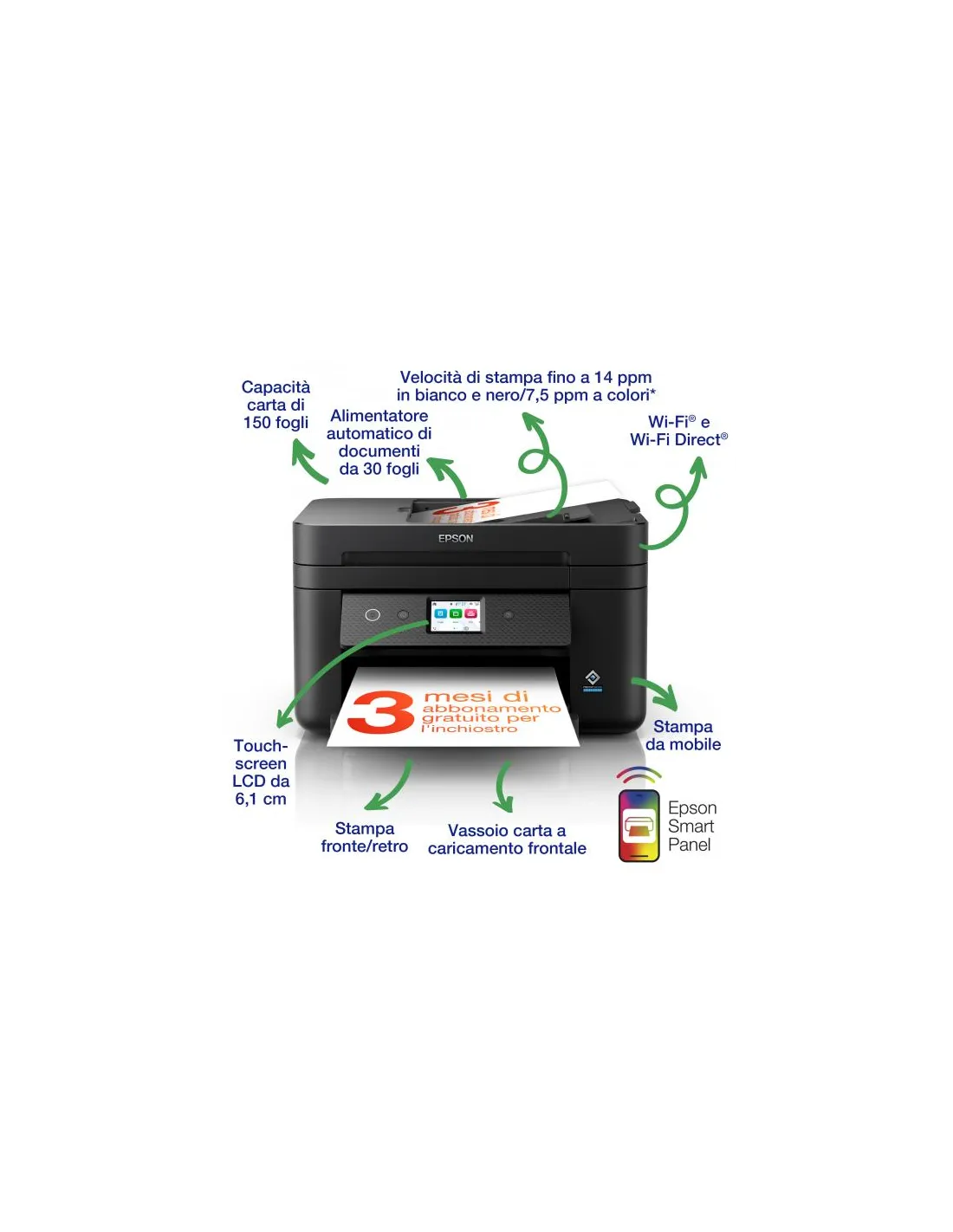 EpsonWorkForce WF-2960DWF, Stampanti a getto d'inchiostro, MicroBusiness/Multi-fuction/Business, C4 (busta), 4 Cartucce di inchiostro, KCYM, Stampa, Scansione, Copia, Fax, Sì (A4, carta comune), 4.800 x 1.200 dpi, 33 pagine/min Monocromatico (carta comune), 20 pagine/min Colour (carta comune), 150 fogli standard, 20 input:, 1.200 dpi x 2.400 dpi (Orizzontale x Verticale), 30 pagine, Display LCD: Tipo: a colori, Touch-screen, diagonale: 6,1 cm , USB Hi-Speed - Compatibile con la specifica USB 2.0, LAN wireless IEEE 802.11b/g/n, Wi-Fi Direct, interfaccia Ethernet (100Base-TX / 10Base-T), Epson Event Manager, Epson Fax Utility, Epson Photo+, Epson ScanSmart, Mac OS 10.9.x, Windows 10, Windows 11, Windows 7, Windows 8, Windows Server 2003, Windows Server 2008 R2, Windows Server 2012 (64bit), Windows Server 2012 R2, Windows Server 2016, Windows Vista, Windows XP Professional x64 Edition SP2 or later, Windows XP SP3 or later (32-bit), macOS 11 or later, Cartucce di inchiostro separate, Unità principale, Cavo di alimentazione, Guida all'installazione, Documento di garanzia, 12 mesi Assistenza on-center (presso un centro autorizzato)